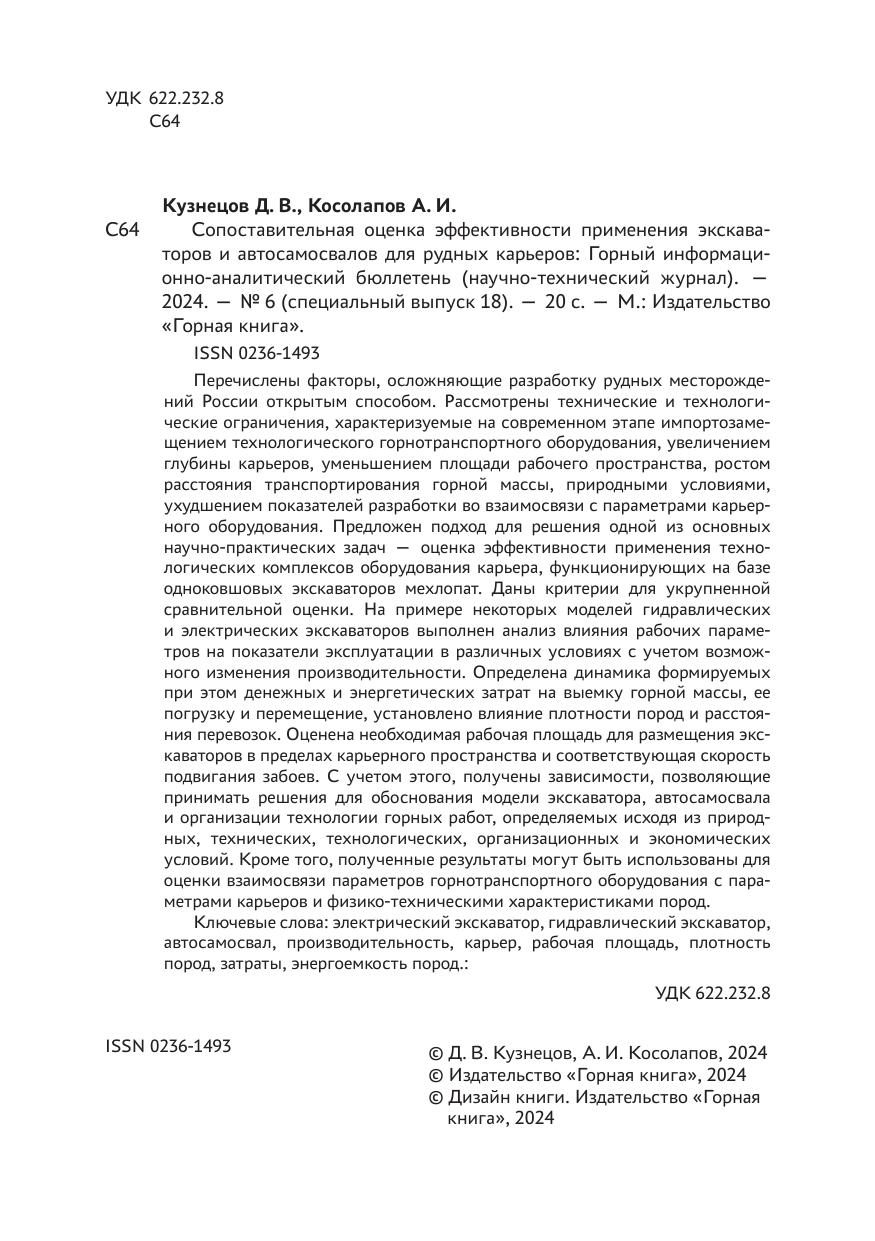 Сопоставительная оценка эффективности применения экскаваторов и автосамосвалов для рудных карьеров: горный информационно-аналитический бюллетень № 6. Специальный выпуск 18