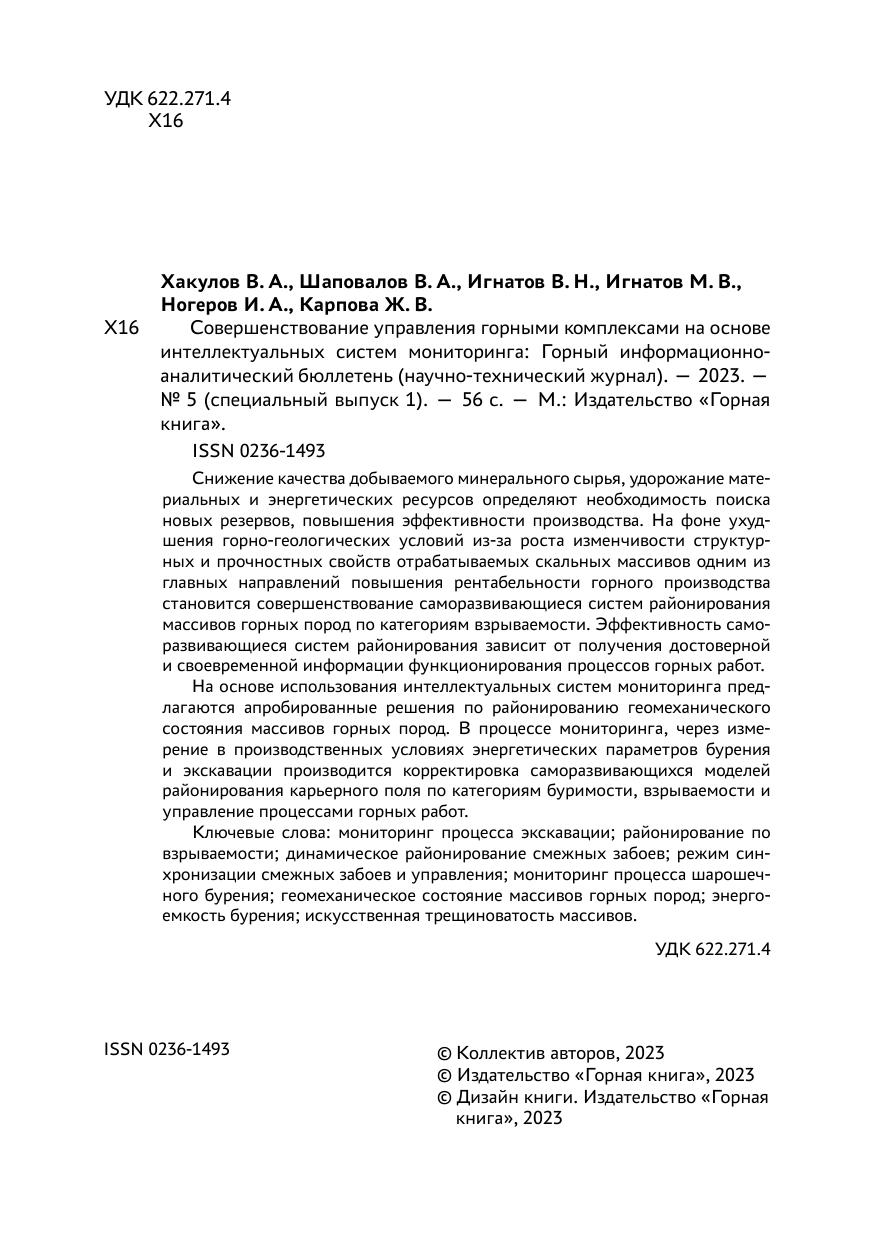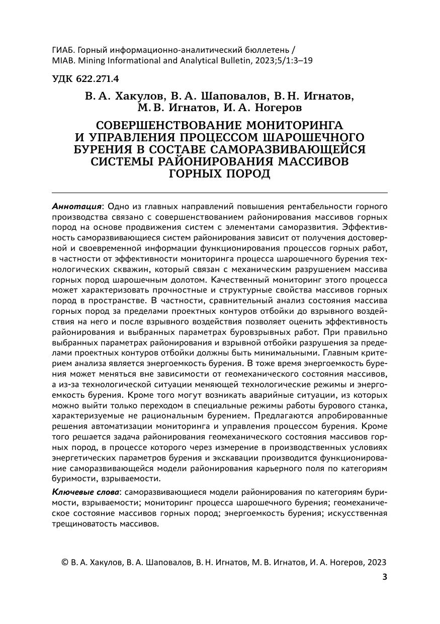 Снижение качества добываемого минерального сырья, удорожание материальных и энергетических ресурсов определяют необходимость поиска новых резервов, повышения эффективности производства. На фоне ухудшения горно-геологических условий из-за роста изменчивости структурных и прочностных свойств отрабатываемых скальных массивов одним из главных направлений повышения рентабельности горного производства становится совершенствование саморазвивающиеся систем районирования массивов горных пород по категориям взрываемости. Эффективность саморазвивающиеся систем районирования зависит от получения достоверной и своевременной информации функционирования процессов горных работ. На основе использования интеллектуальных систем мониторинга предлагаются апробированные решения по районированию геомеханического состояния массивов горных пород. В процессе мониторинга, через измерение в производственных условиях энергетических параметров бурения и экскавации производится корректировка саморазвивающихся моделей районирования карьерного поля по категориям буримости, взрываемости и управление процессами горных работ.