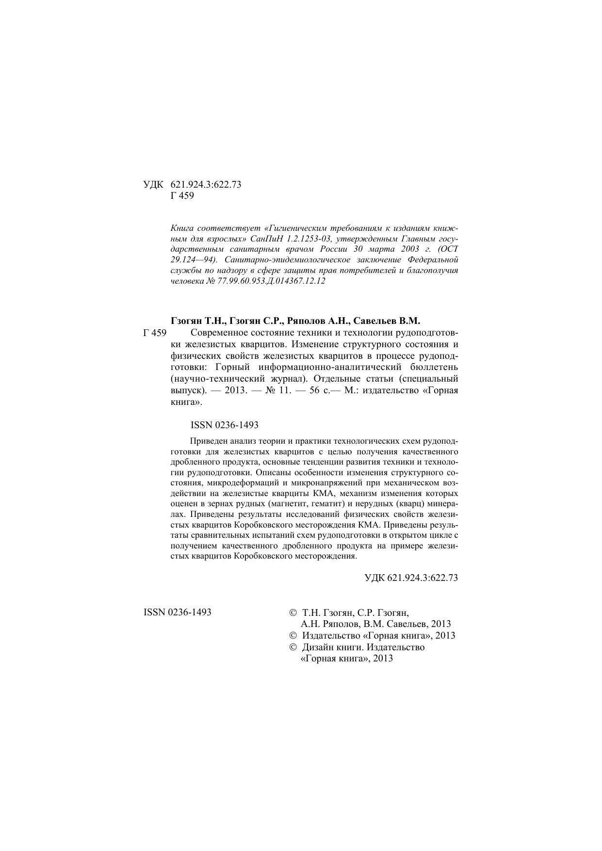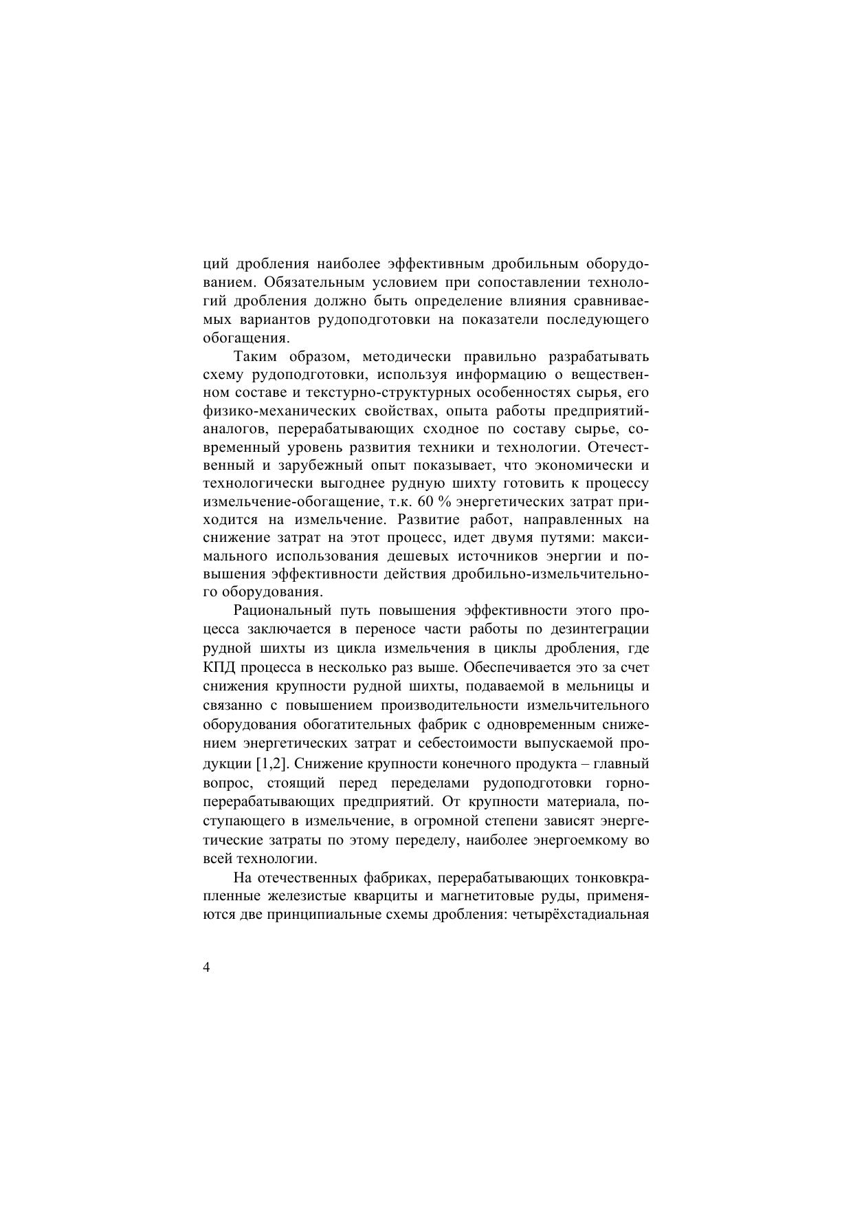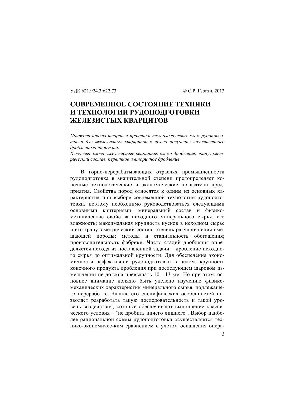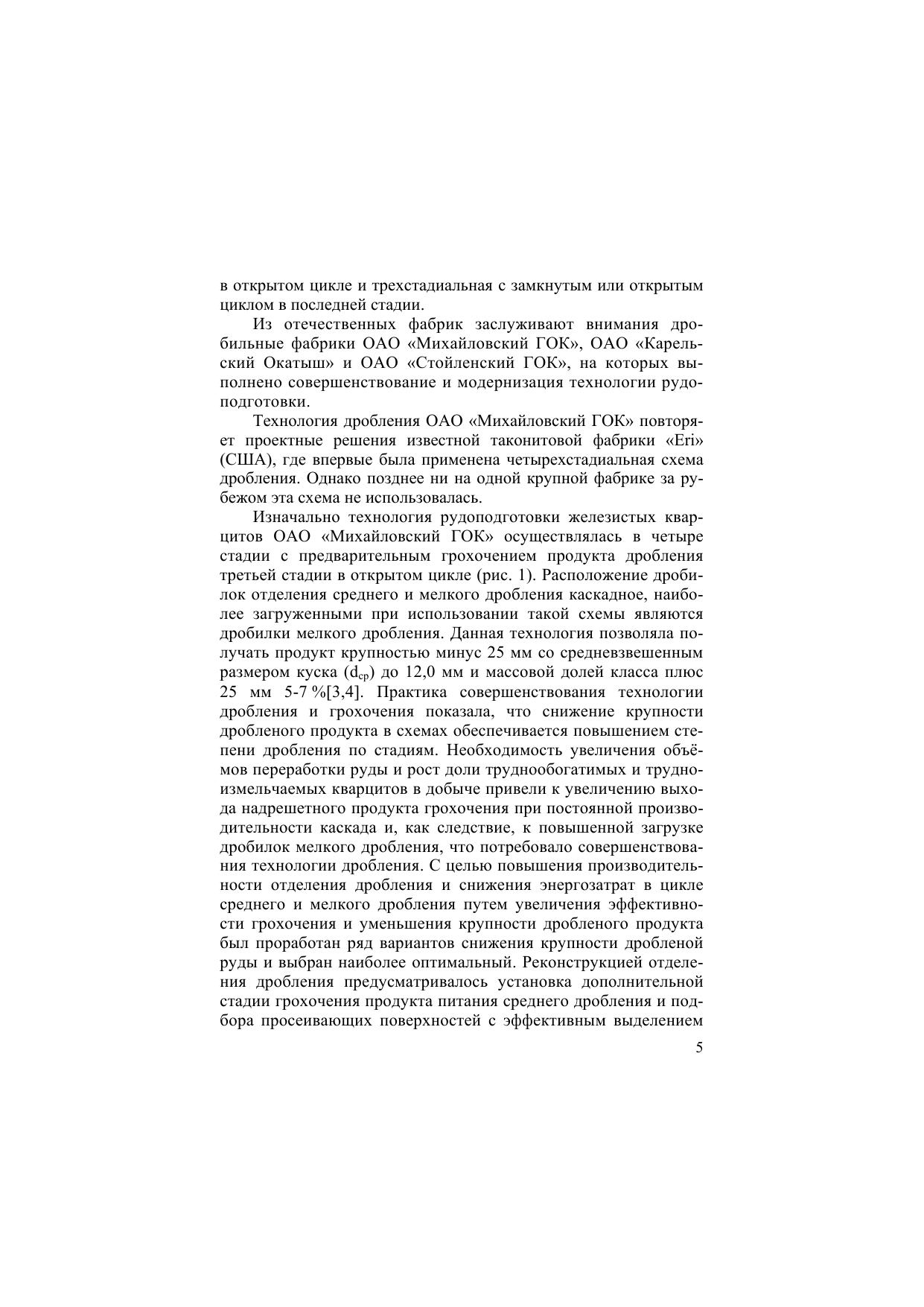 Приведен анализ теории и практики технологических схем рудоподготовки для железистых кварцитов с целью получения качественного дробленного продукта, основные тенденции развития техники и технологии рудоподготовки. Описаны особенности изменения структурного состояния, микродеформаций и микронапряжений при механическом воздействии на железистые кварциты КМА, механизм изменения которых оценен в зернах рудных (магнетит, гематит) и нерудных (кварц) минералах. Приведены результаты исследований физических свойств железистых кварцитов Коробковского месторождения КМА. Приведены результаты сравнительных испытаний схем рудоподготовки в открытом цикле с получением качественного дробленного продукта на примере железистых кварцитов Коробковского месторождения.