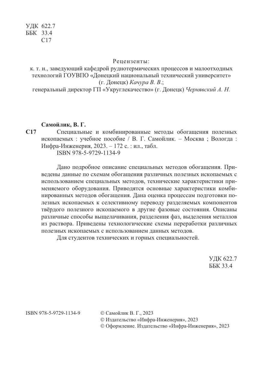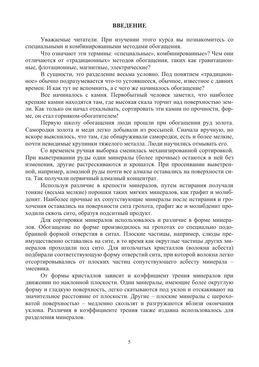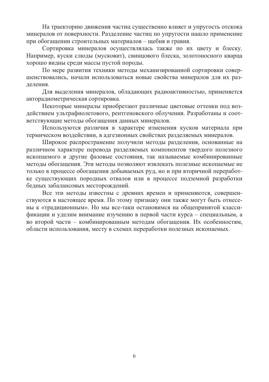 Дано подробное описание специальных методов обогащения. Приведены данные по схемам обогащения различных полезных ископаемых с использованием специальных методов, технические характеристики применяемого оборудования. Приводятся основные характеристики комбинированных методов обогащения. Дана оценка процессам подготовки полезных ископаемых к селективному переводу разделяемых компонентов твёрдого полезного ископаемого в другие фазовые состояния. Описаны различные способы выщелачивания, разделения фаз, выделения металлов из раствора. Приведены технологические схемы переработки различных полезных ископаемых с использованием данных методов.