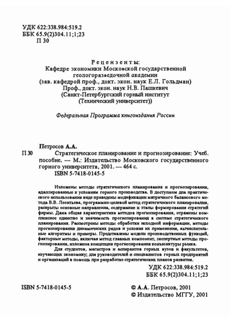 Изложены методы стратегического планирования и прогнозирования, адаптированные к условиям горного производства, систематизированы виды и источники экономических рисков и их возможные экономические последствия, описаны приемы и методы управления рисками. Приведены модификации матричного балансового метода на основе модели В.В. Леонтьева, рассмотрен программно-целевой метод стратегического планирования, раскрыты направления, содержание и этапы формирования стратегий фирмы. На основе детального СВОТ-анализа состояния и прогнозов динамики показателей основных отраслей народного хозяйства РФ проанализированы тенденции перспективного развития горно-добывающих отраслей. Дана характеристика методов прогнозирования, отражены комплексное единство и значимость прогнозирования в системе стратегического планирования. Представлены методы обработки исходной информации, прогнозирования динамических рядов и рассмотрены условия их применения, вычислительные алгоритмы и примеры расчета. Приведены модели производственных функций, факторные и экспертные методы прогнозирования. А.А. Петросов - д-р техн. наук, профессор кафедры Экономики и планирования горного производства Московского государственного горного университета. Для студентов вузов, обучающихся по направлению подготовки «Горное дело» и по специальности «Экономика и управление на предприятии (горная промышленность)» направления подготовки «Экономика».