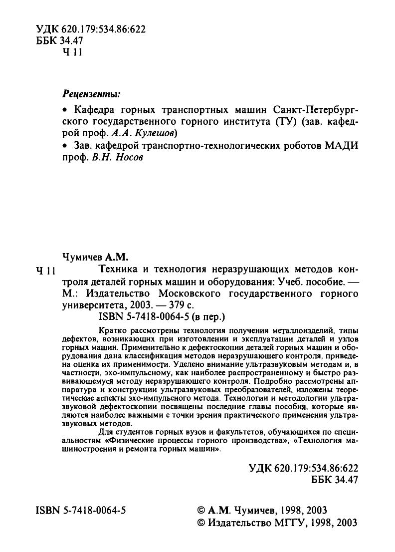 Кратко рассмотрены технология получения металлоизделий, типы дефектов, возникающих при изготовлении и эксплуатации деталей и узлов горных машин Применительно к дефектоскопии деталей горных машин и оборудования дана классификация методов неразрушающего контроля, приведена оценка их применимости. Уделено внимание ультразвуковым методам и, в частности, эхо-импульсному, как наиболее распространенному и быстро развивающемуся методу неразрушающего контроля. Подробно рассмотрены аппаратура и конструкции ультразвуковых преобразователей, изложены теоретические аспекты эхо-импульсного метода. Технологии и методологии ультразвуковой дефектоскопии посвящены последние главы пособия, которые являются наиболее важными с точки зрения практического применения ультразвуковых методов. Для студентов горных вузов и факультетов, обучающихся по специальностям «Физические процессы горного производства», «Технология машиностроения и ремонта горных машин».