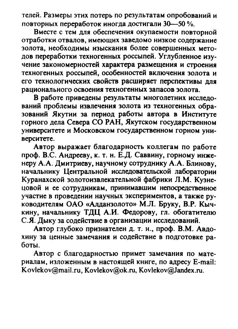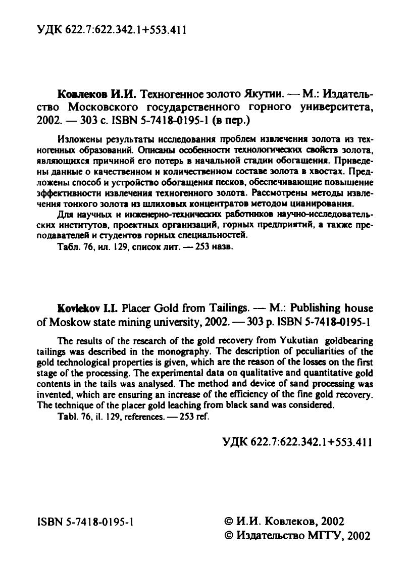 Изложены результаты исследования проблем извлечения золота из техногенных образований. Описаны особенности технологических свойств золота, являющихся причиной его потерь в начальной стадии обогащения. Приведены данные о качественном и количественном составе золота в хвостах. Предложены способ и устройство обогащения песков, обеспечивающие повышение эффективности извлечения техногенного золота. Рассмотрены методы извлечения тонкого золота из шлиховых концентратов методом цианирования. Для научных и инженерно-технических работников научно-исследовательских институтов, проектных организаций, горных предприятий, а также преподавателей и студентов горных специальностей.