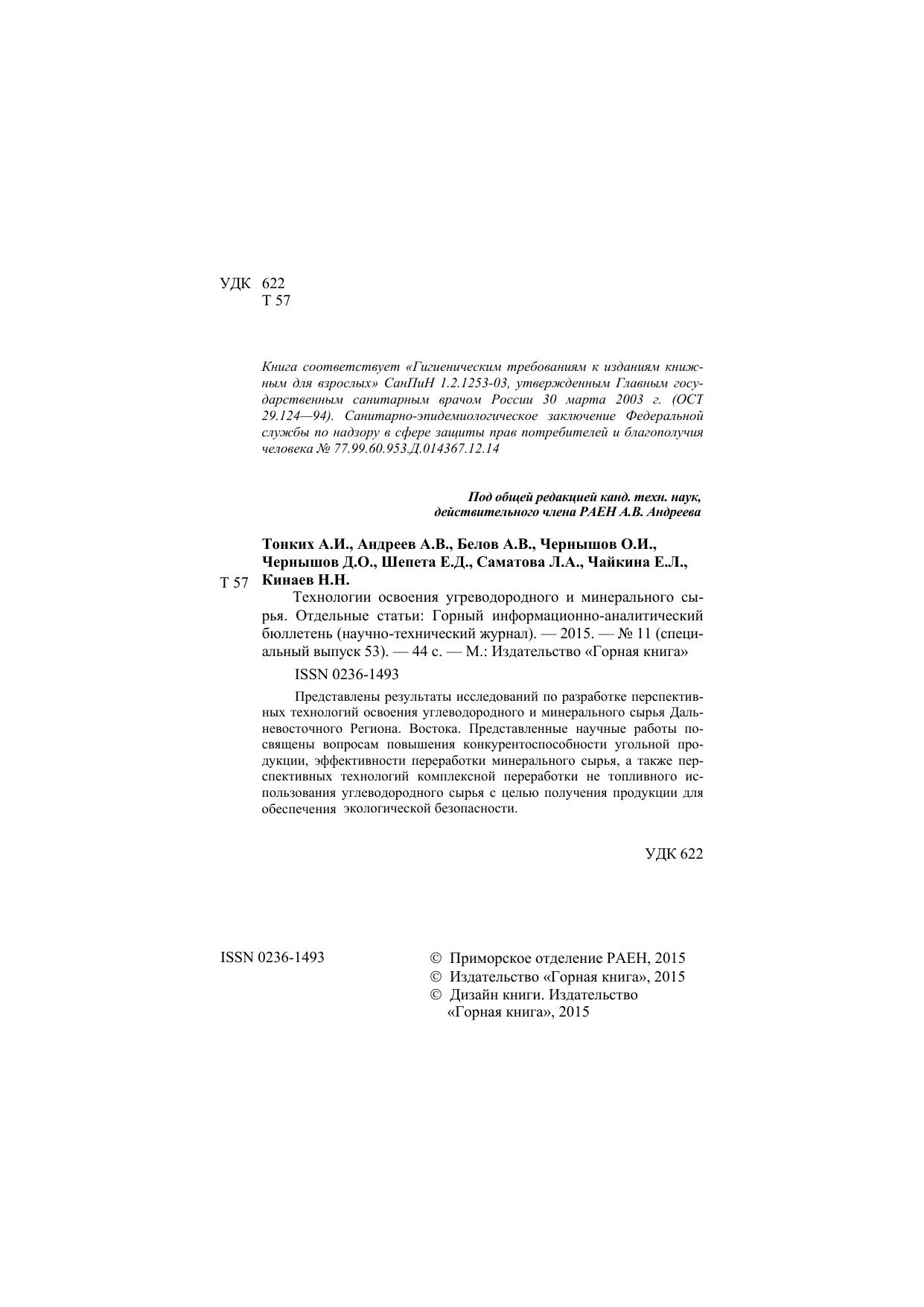 Технологии освоения угреводородного и минерального сырья. Отдельные статьи: Горный информационно-аналитический бюллетень (научно-технический журнал)