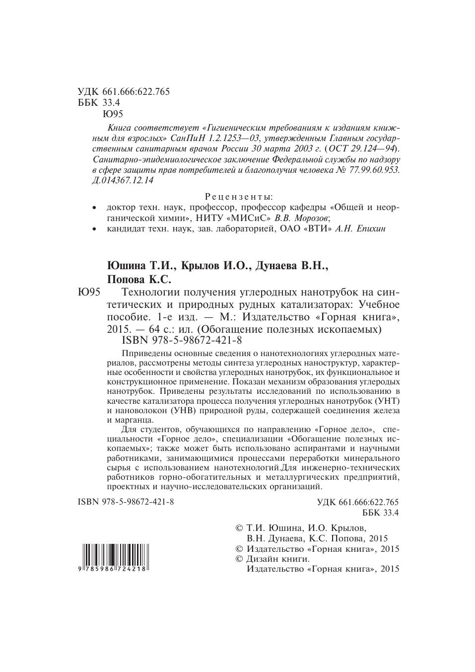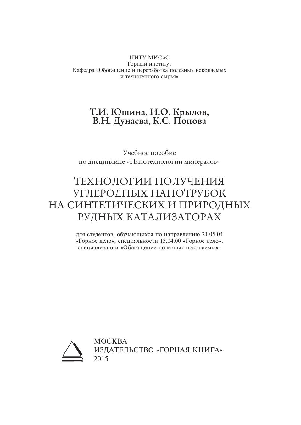 Приведены основные сведения о нанотехнологиях углеродных материалов, рассмотрены методы синтеза углеродных наноструктур, характерные особенности и свойства углеродных нанотрубок, их функциональное и конструкционное применение. Показан механизм образования углеродых нанотрубок. Приведены результаты исследований по использованию в качестве катализатора процесса получения углеродных нанотрубок (УНТ) и нановолокон (УНВ) природной руды, содержащей соединения железа и марганца. Для студентов, обучающихся по направлению «Горное дело», специальности «Горное дело», специализации «Обогащение полезных ископаемых»; также может быть использовано аспирантами и научными работниками, занимающимися процессами переработки минерального сырья с использованием нанотехнологий.Для инженерно-технических работников горно-обогатительных и металлургических предприятий, проектных и научно-исследовательских организаций.