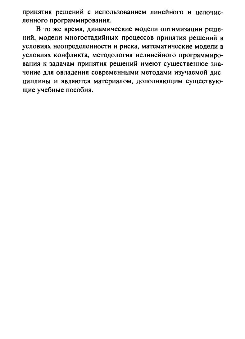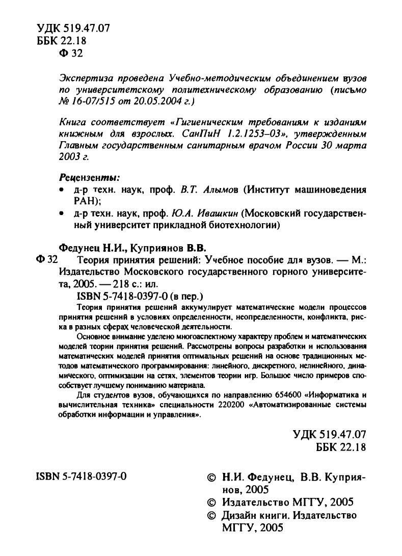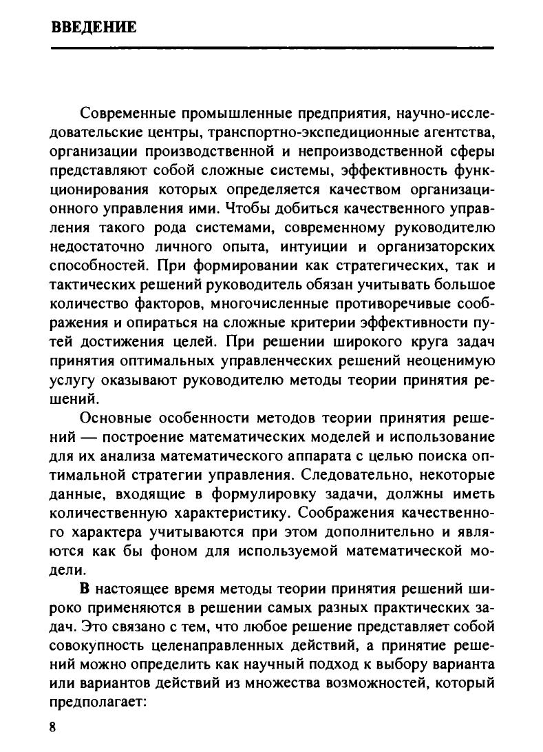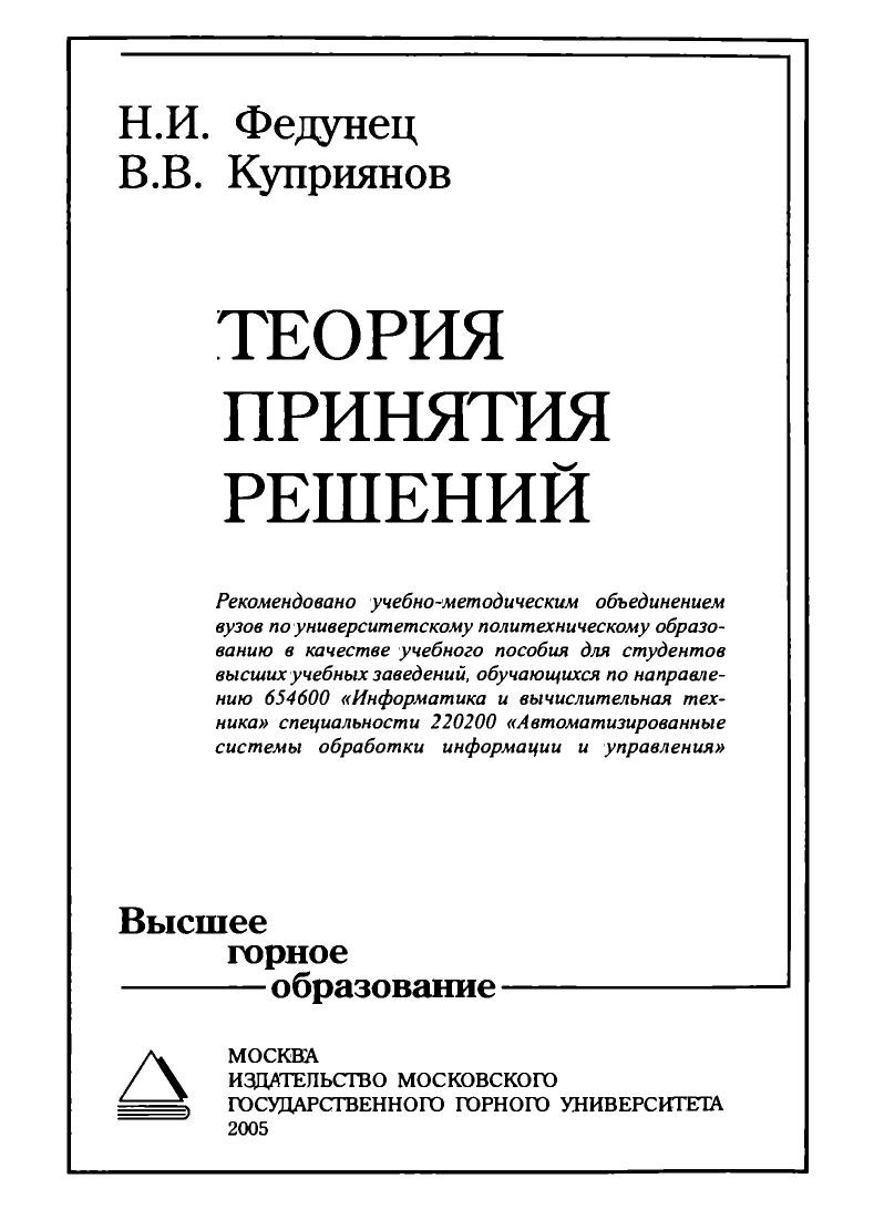 Теория принятия решений аккумулирует математические модели процессов принятия решений в условиях определенности, неопределенности, конфликта, риска в разных сферах человеческой деятельности. Основное внимание уделено многоаспектному характеру проблем и математических моделей теории принятия решений. Рассмотрены вопросы разработки и использования математических моделей принятия оптимальных решений на основе традиционных методов математического программирования: линейного, дискретного, нелинейного, динамического, оптимизации на сетях, элементов теории игр. Большое число примеров способствует лучшему пониманию материала. Для студентов вузов, обучающихся по направлению 654600 «Информатика и вычислительная техника» специальности 220200 «Автоматизированные системы обработки информации и управления».