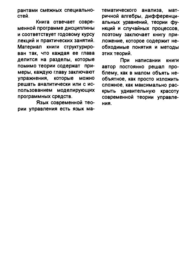 Представлен обобщенный, годовой курс лекций по теории автоматического управления. Содержит основные разделы современной теории управления динамическими системами. Приведены упражнения для практических занятий. В приложениях даны справочные сведения математического аппарата теории. Для студентов специальностей.