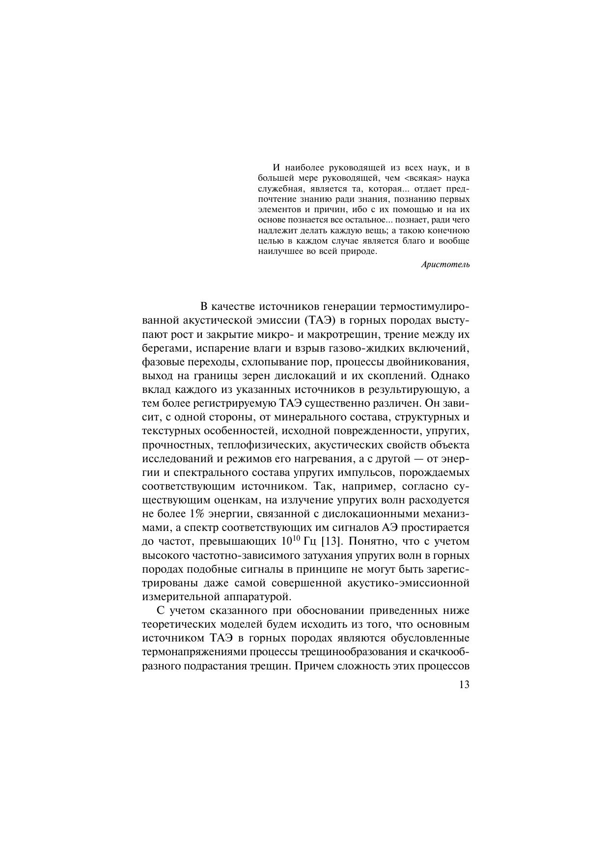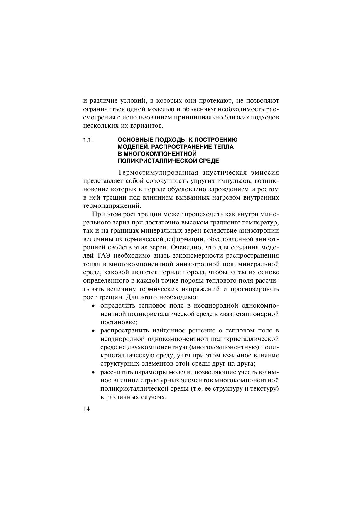 Представлены результаты теоретических и экспериментальных исследований термостимулированной акустической эмиссии (ТАЭ) в геоматериалах. Рассмотрены теоретические модели, объясняющие некоторые механизмы формирования ТАЭ, обусловленные действующими в геосреде термонапряжениями. Дано описание аппаратурного и методического обеспечения для измерения параметров ТАЭ в образцах геоматериалов при различных схемах и режимах термического воздей-