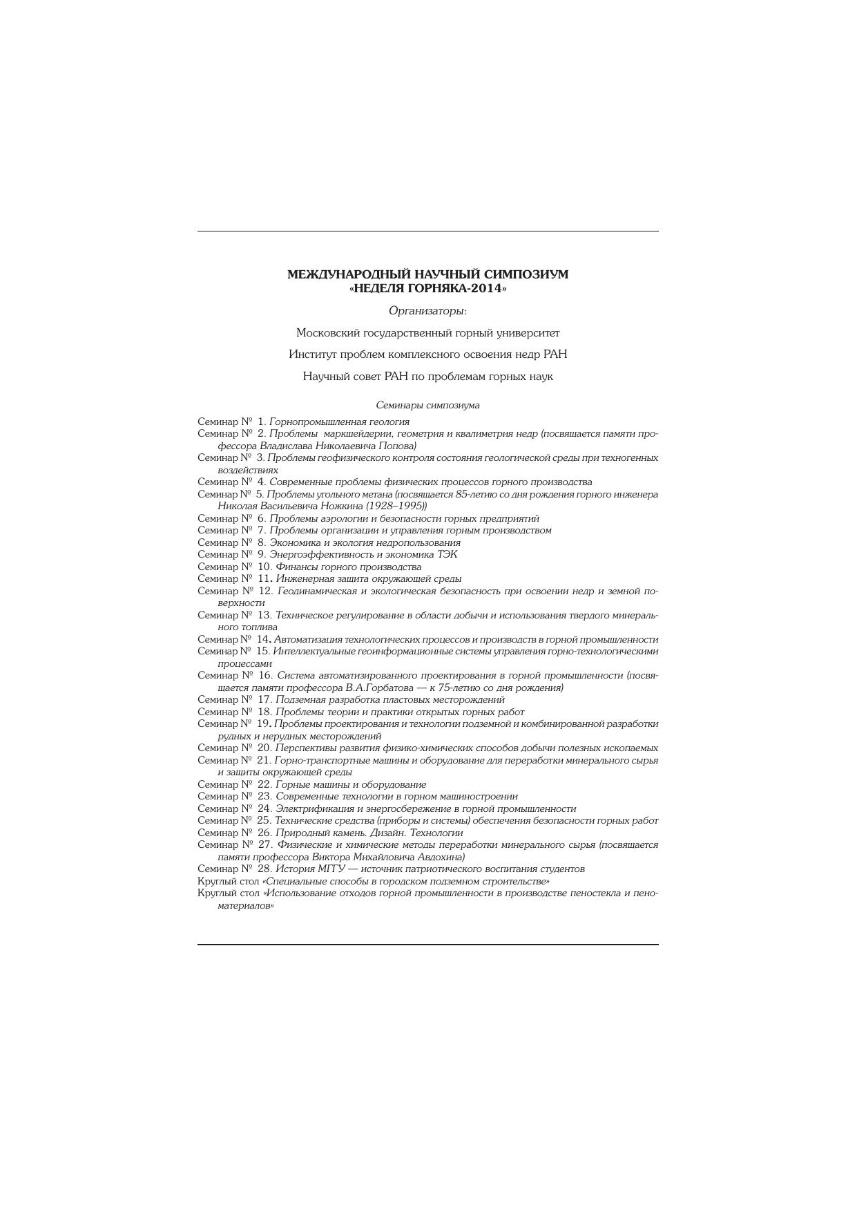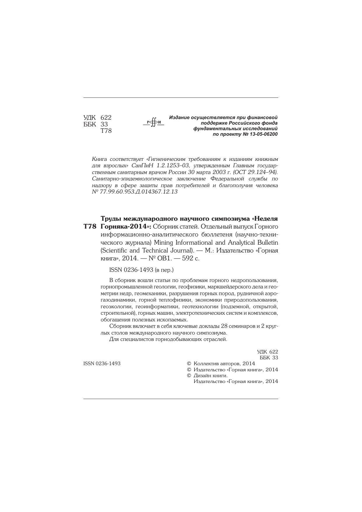 Труды международного научного симпозиума «Неделя Горняка-2014»: Сборник статей. Отдельный выпуск Горного информационно-аналитического бюллетеня (научно-технического журнала) Mining Informational and Analytical Bulletin (Scientific and Technical Journal)