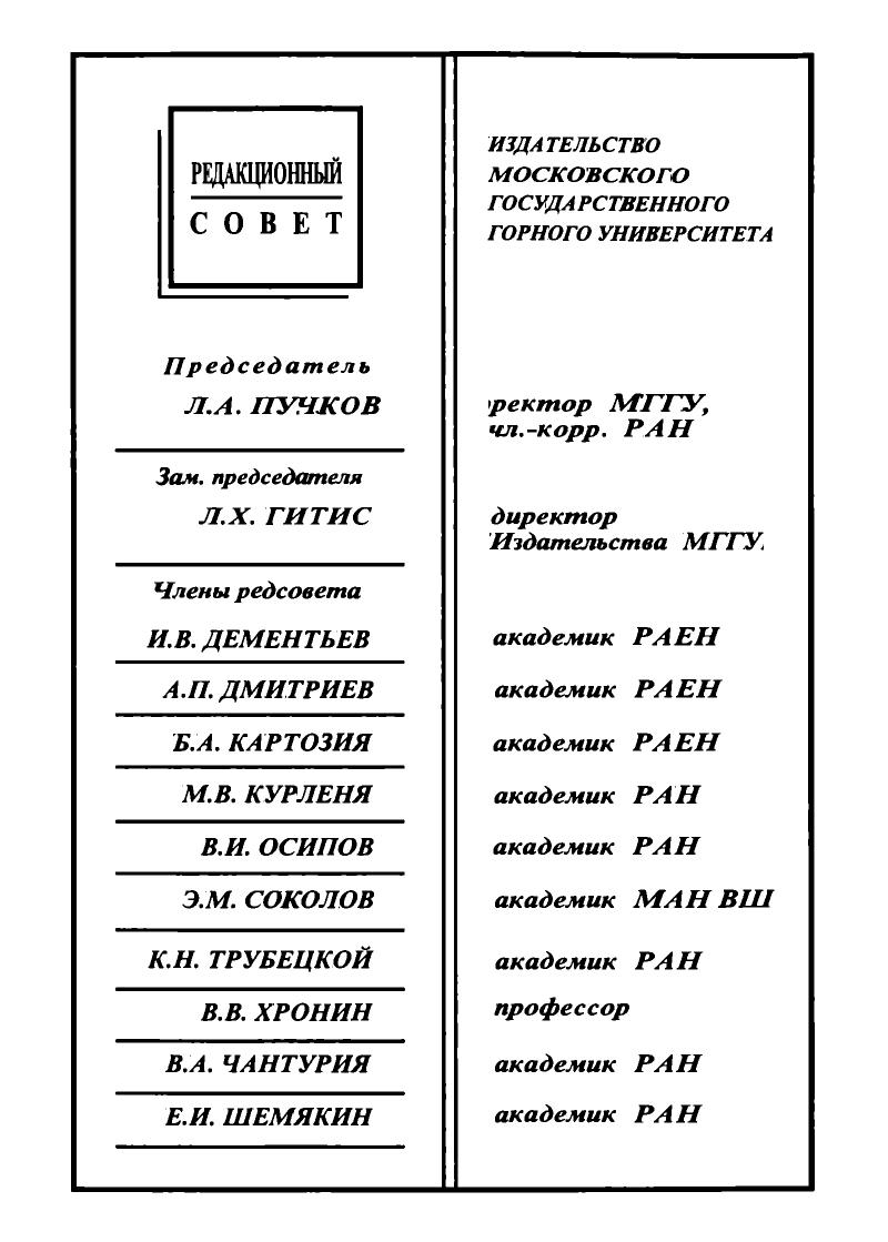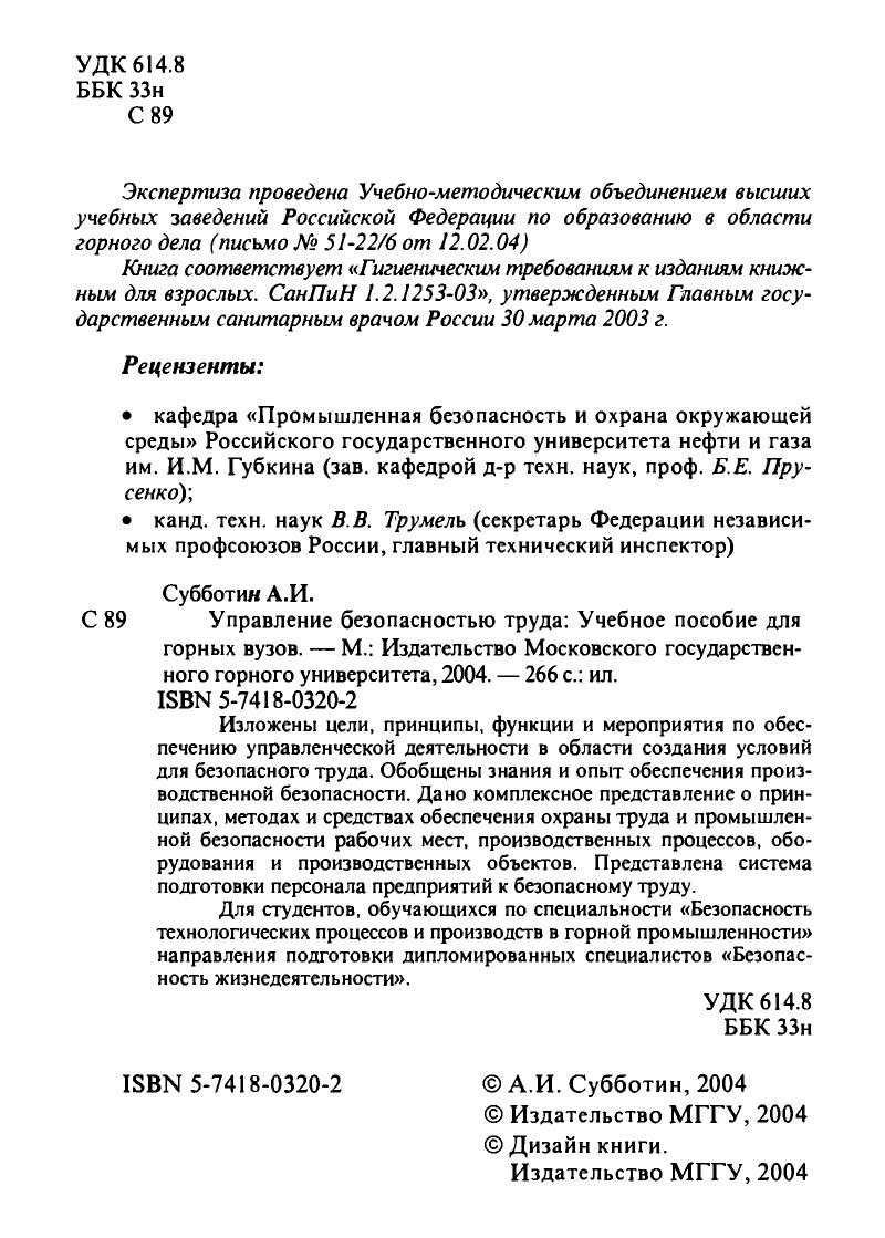 Гриф: Допущено Учебно-методическим объединением вузов Российской Федерации по образованию в области горного дела в качестве учебного пособия для студентов вузов, обучающихся по специальности «Безопасность технологических процессов и производств в горной промышленности» направления подготовки дипломированных специалистов «Безопасность жизнедеятельности».