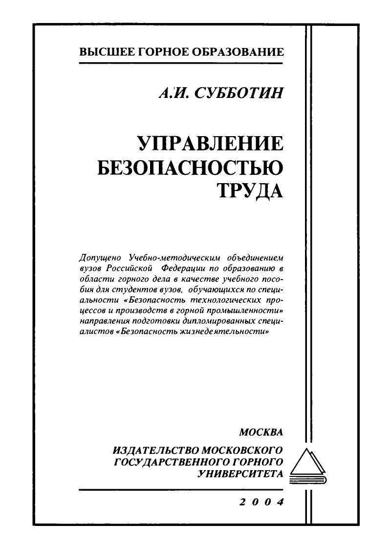 Изложены цели, принципы, функции и мероприятия по обеспечению управленческой деятельности в области создания условий для безопасного труда. Обобщены знания и опыт обеспечения производственной безопасности. Дано комплексное представление о принципах, методах и средствах обеспечения охраны труда и промышленной безопасности рабочих мест, производственных процессов, оборудования и производственных объектов. Представлена система подготовки персонала предприятий к безопасному труду. Для студентов, обучающихся по специальности «Безопасность технологических процессов и производств в горной промышленности» направления подготовки дипломированных специалистов «Безопасность жизнедеятельности».