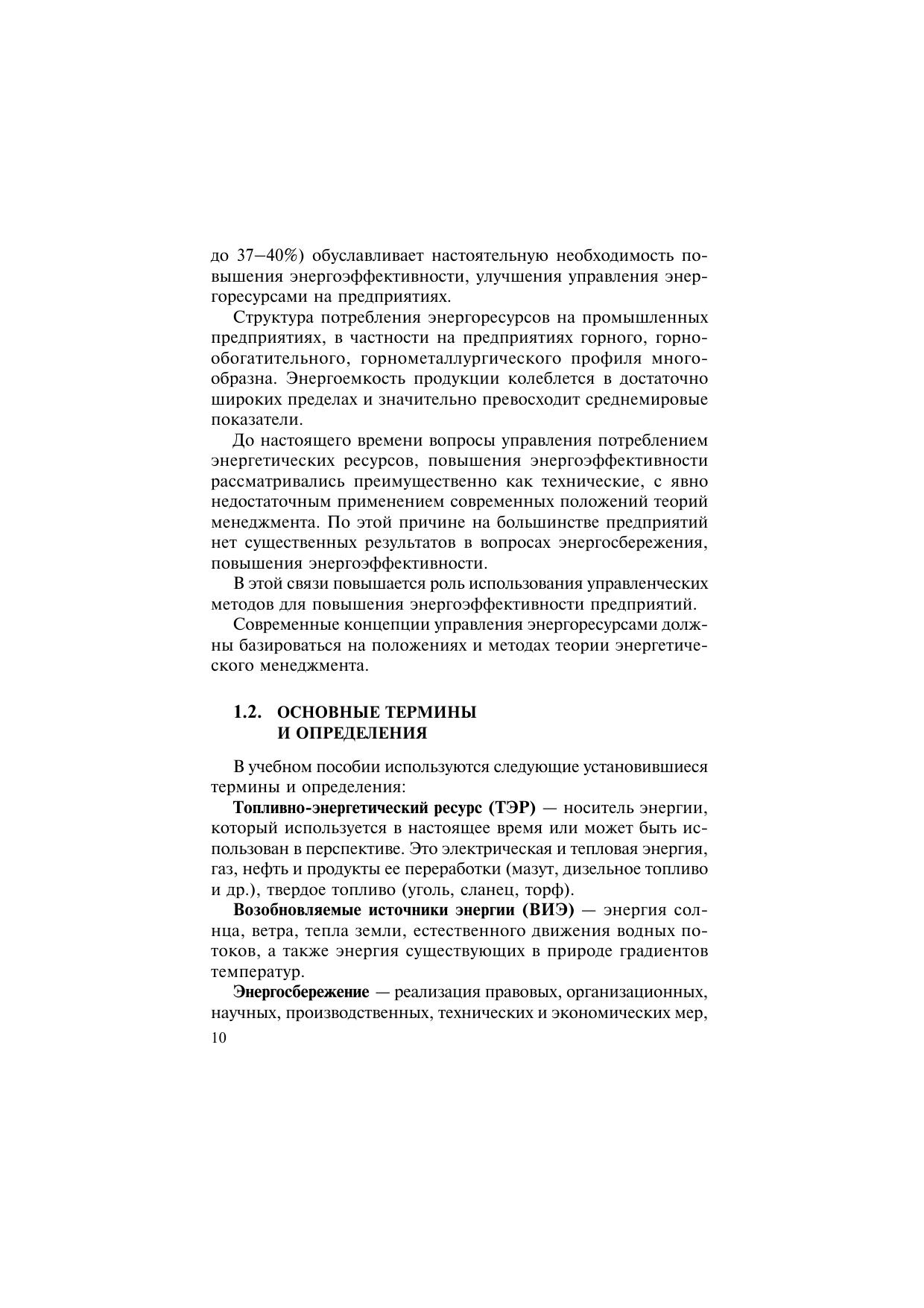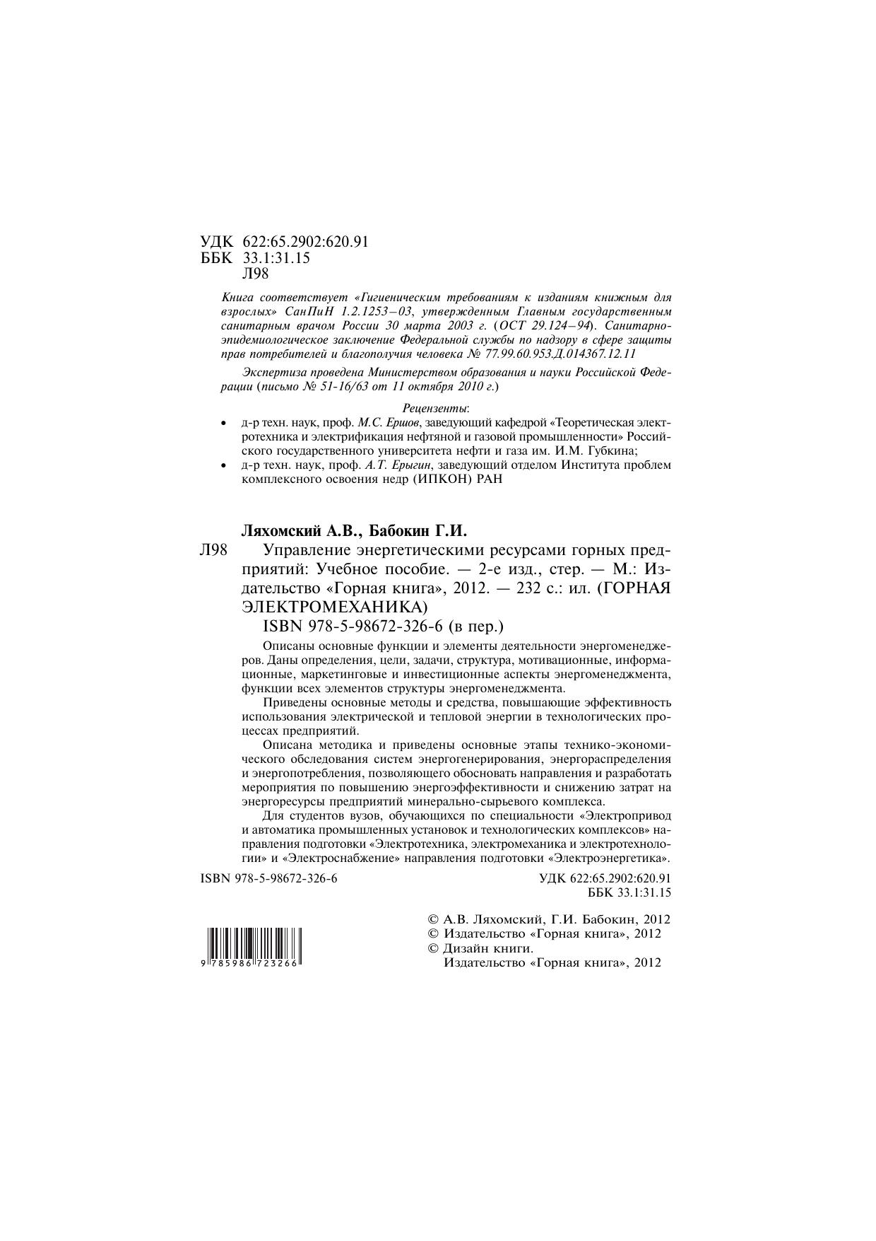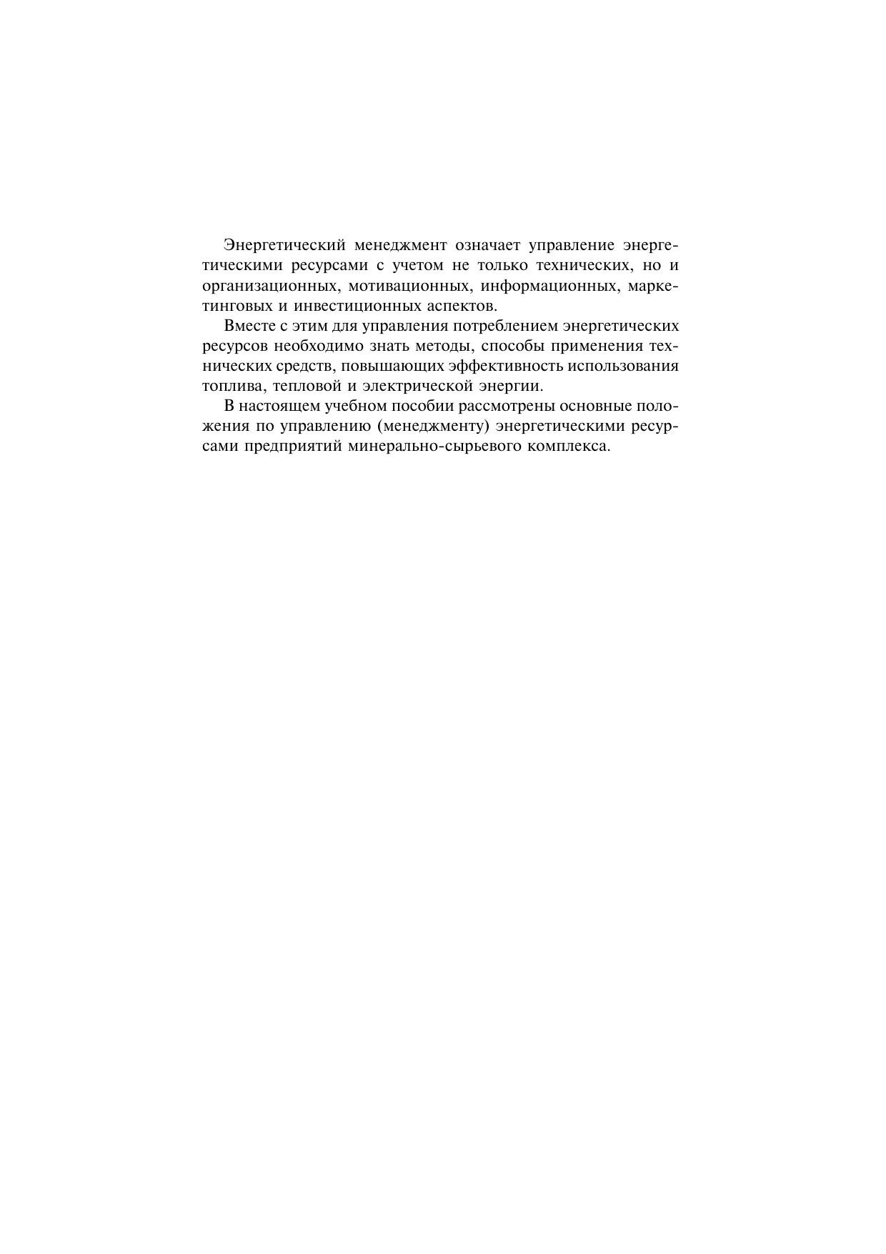 Описаны основные функции и элементы деятельности энергоменеджеров. Даны определения, цели, задачи, структура, мотивационные, информационные, маркетинговые и инвестиционные аспекты энергоменеджмента, функции всех элементов структуры энергоменеджмента. Приведены основные методы и средства, повышающие эффективность использования электрической и тепловой энергии в технологических процессах предприятий. Описана методика и приведены основные этапы технико-экономического обследования систем энергогенерирования, энергораспределения и энергопотребления, позволяющего обосновать направления и разработать мероприятия по повышению энергоэффективности и снижению затрат на энергоресурсы предприятий минерально-сырьевого комплекса. Для студентов вузов, обучающихся по специальности «Электропривод и автоматика промышленных установок и технологических комплексов» направления подготовки «Электротехника, электромеханика и электротехнологии» и «Электроснабжение» направления подготовки «Электроэнергетика»