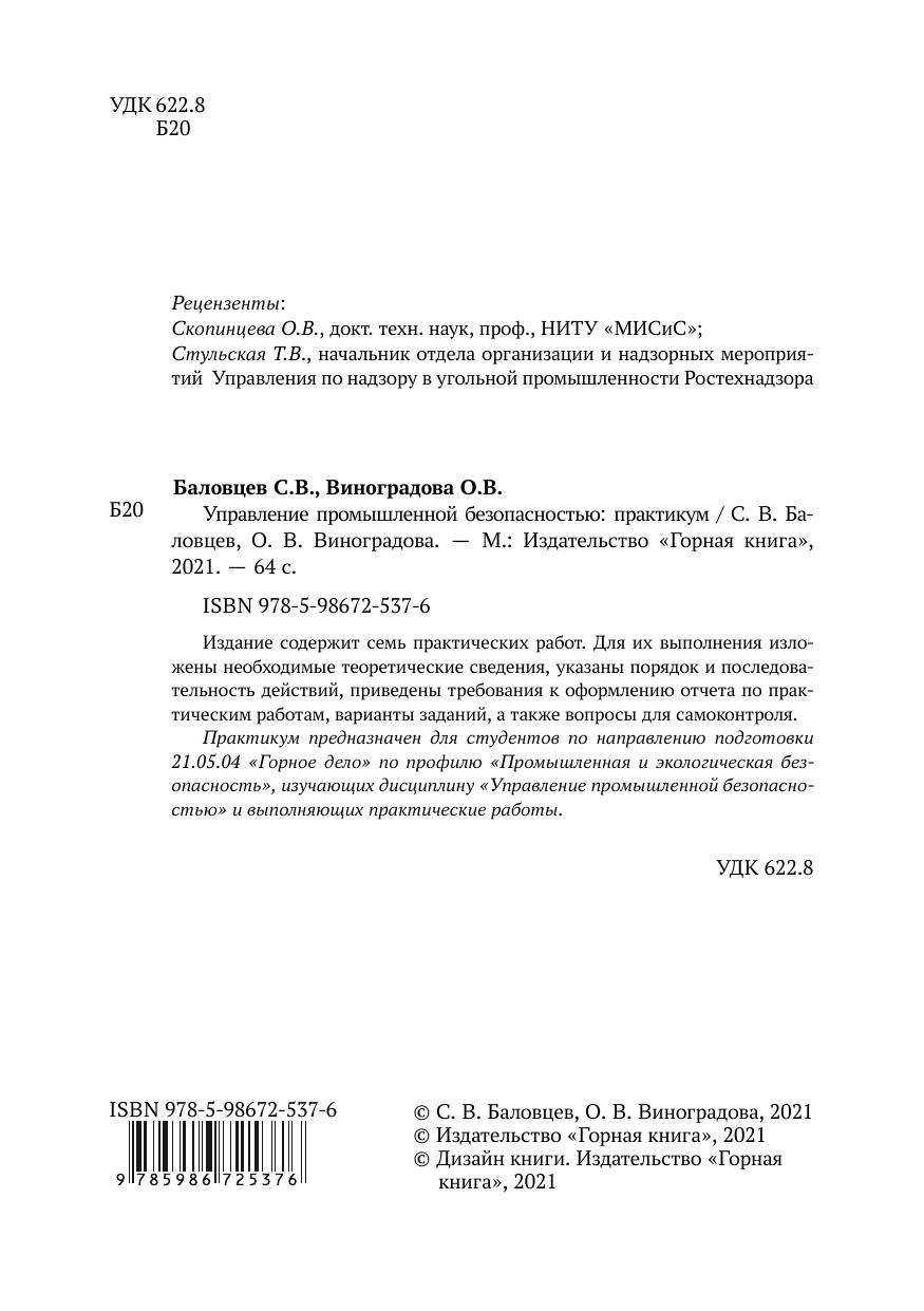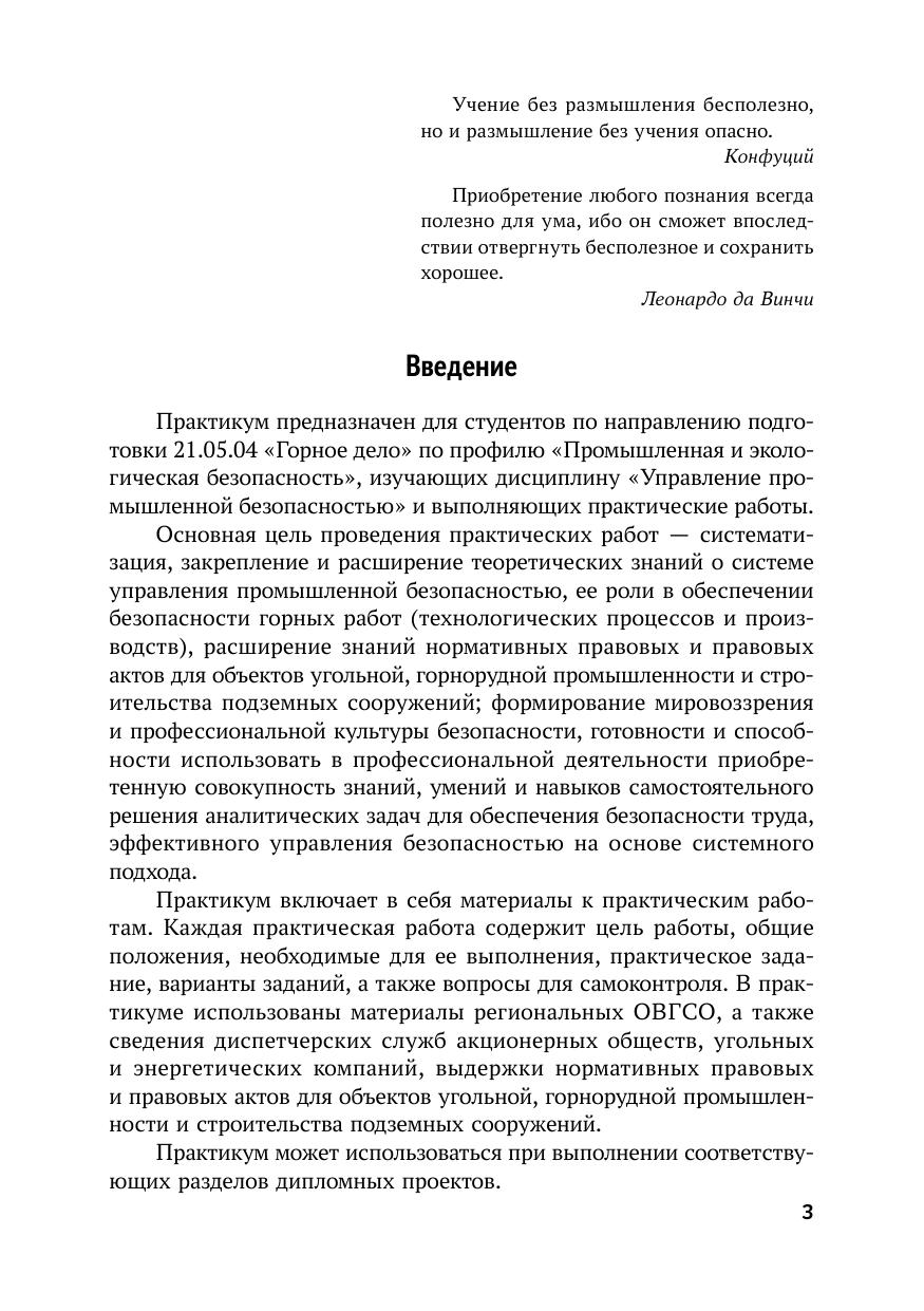 Издание содержит семь практических работ. Для их выполнения изложены необходимые теоретические сведения, указаны порядок и последовательность действий, приведены требования к оформлению отчета по практическим работам, варианты заданий, а также вопросы для самоконтроля. Практикум предназначен для студентов по направлению подготовки 21.05.04 «Горное дело» по профилю «Промышленная и экологическая безопасность», изучающих дисциплину «Управление промышленной безопасностью» и выполняющих практические работы.