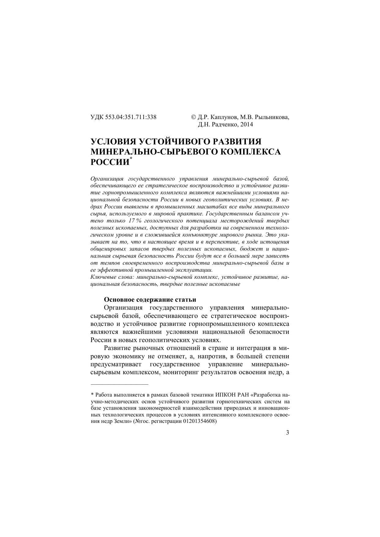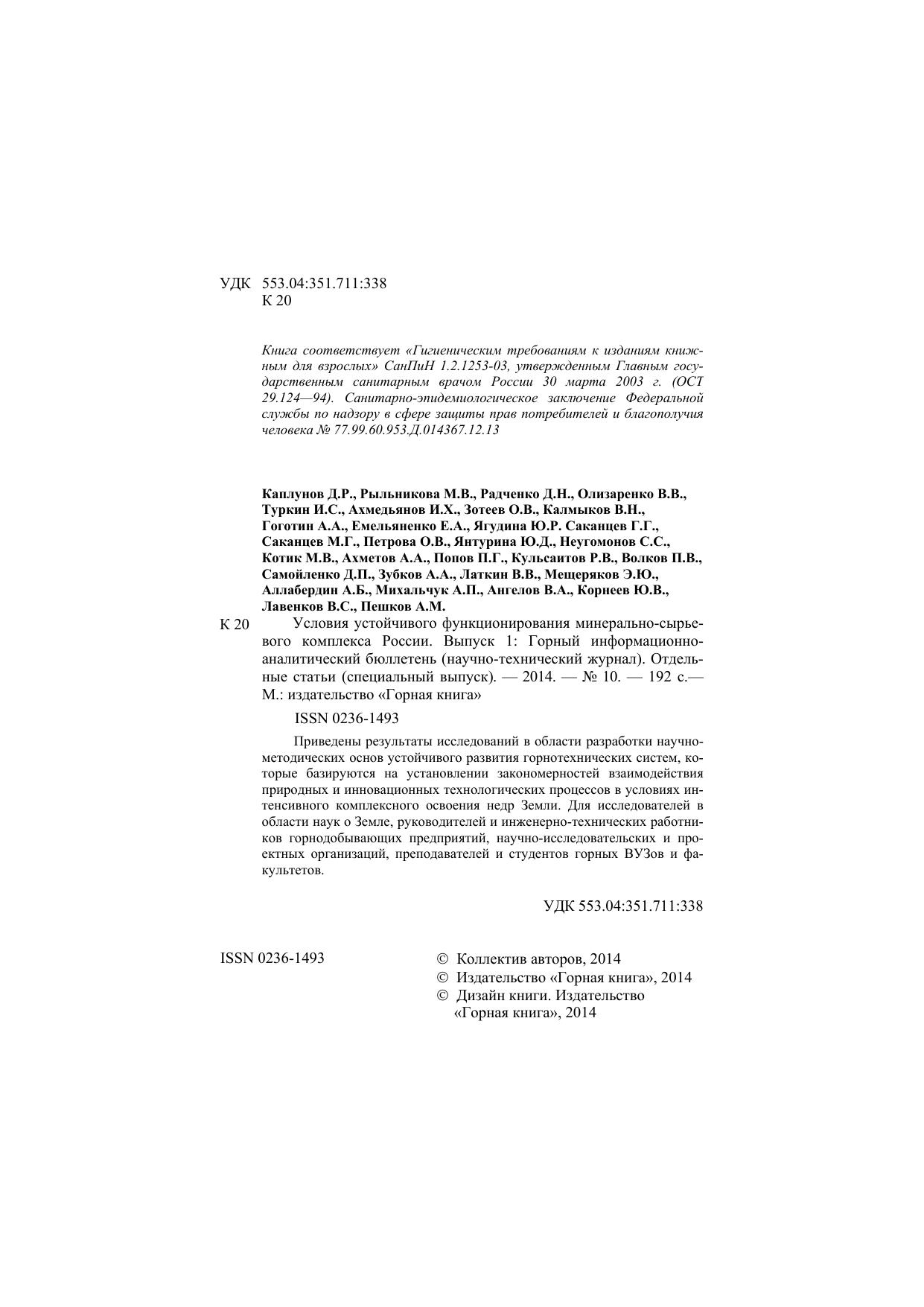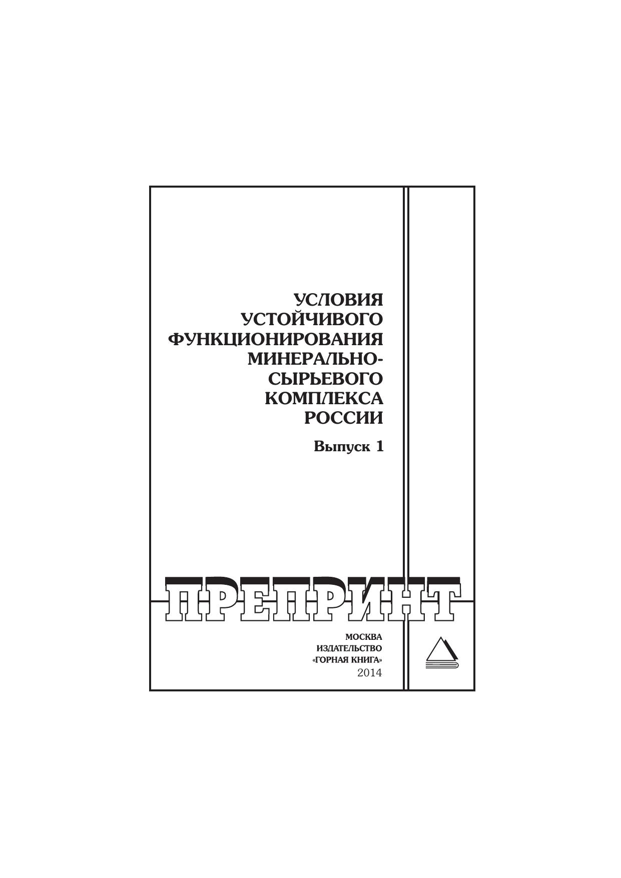 Условия устойчивого функционирования минерально-сырьевого комплекса России. Выпуск 1: Горный информационно-аналитический бюллетень (научно-технический журнал). Отдельные статьи (специальный выпуск)
