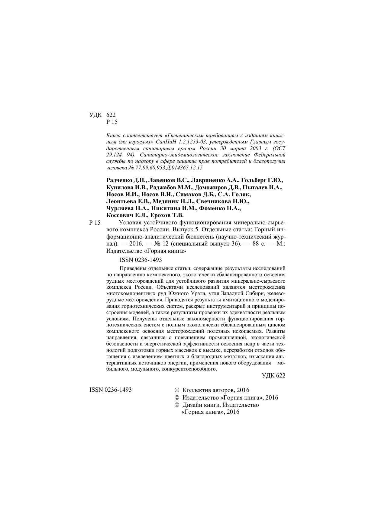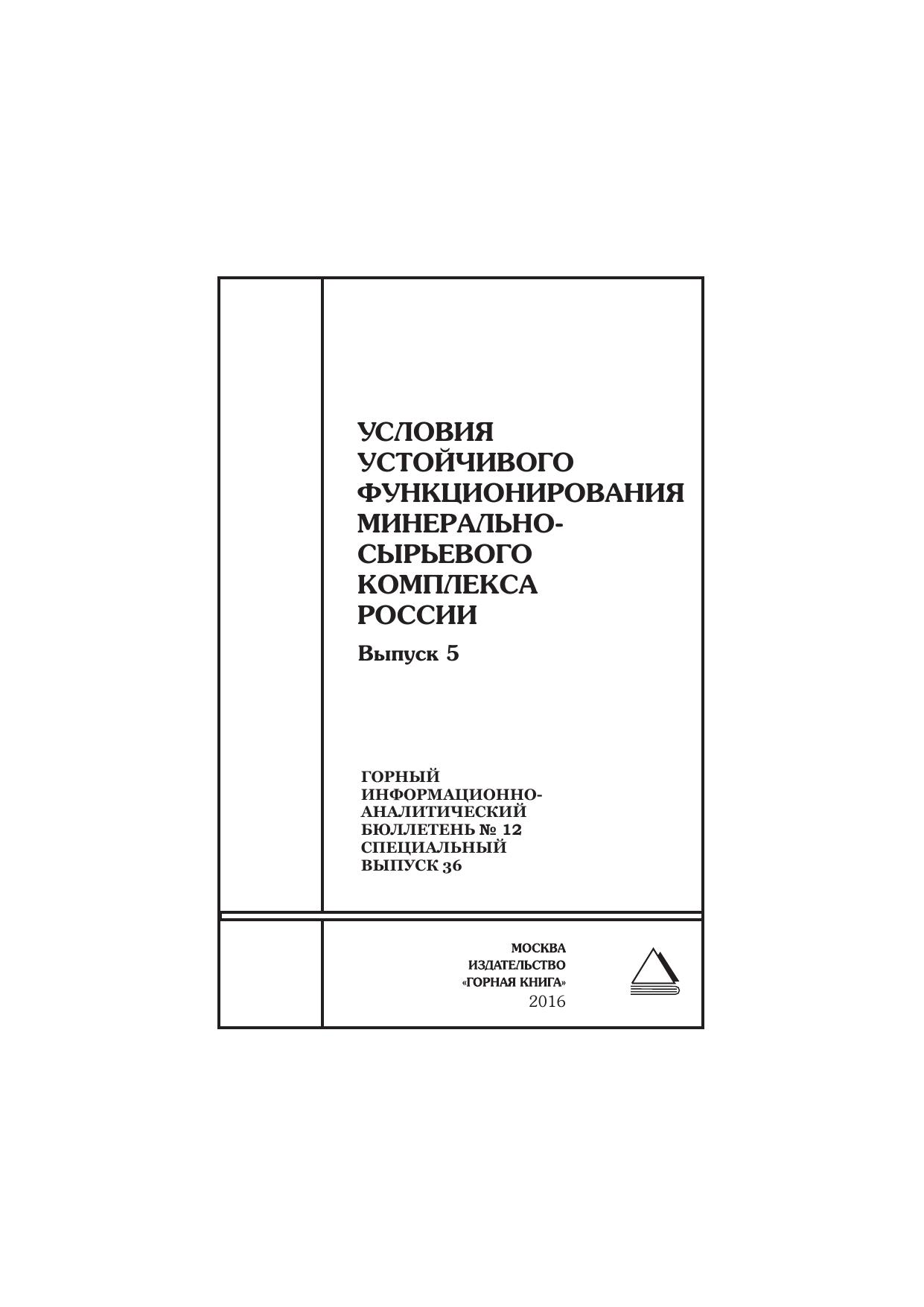 Условия устойчивого функционирования минерально-сырьевого комплекса России. Выпуск 5. Отдельные статьи: Горный информационно-аналитический бюллетень (научно-технический журнал)