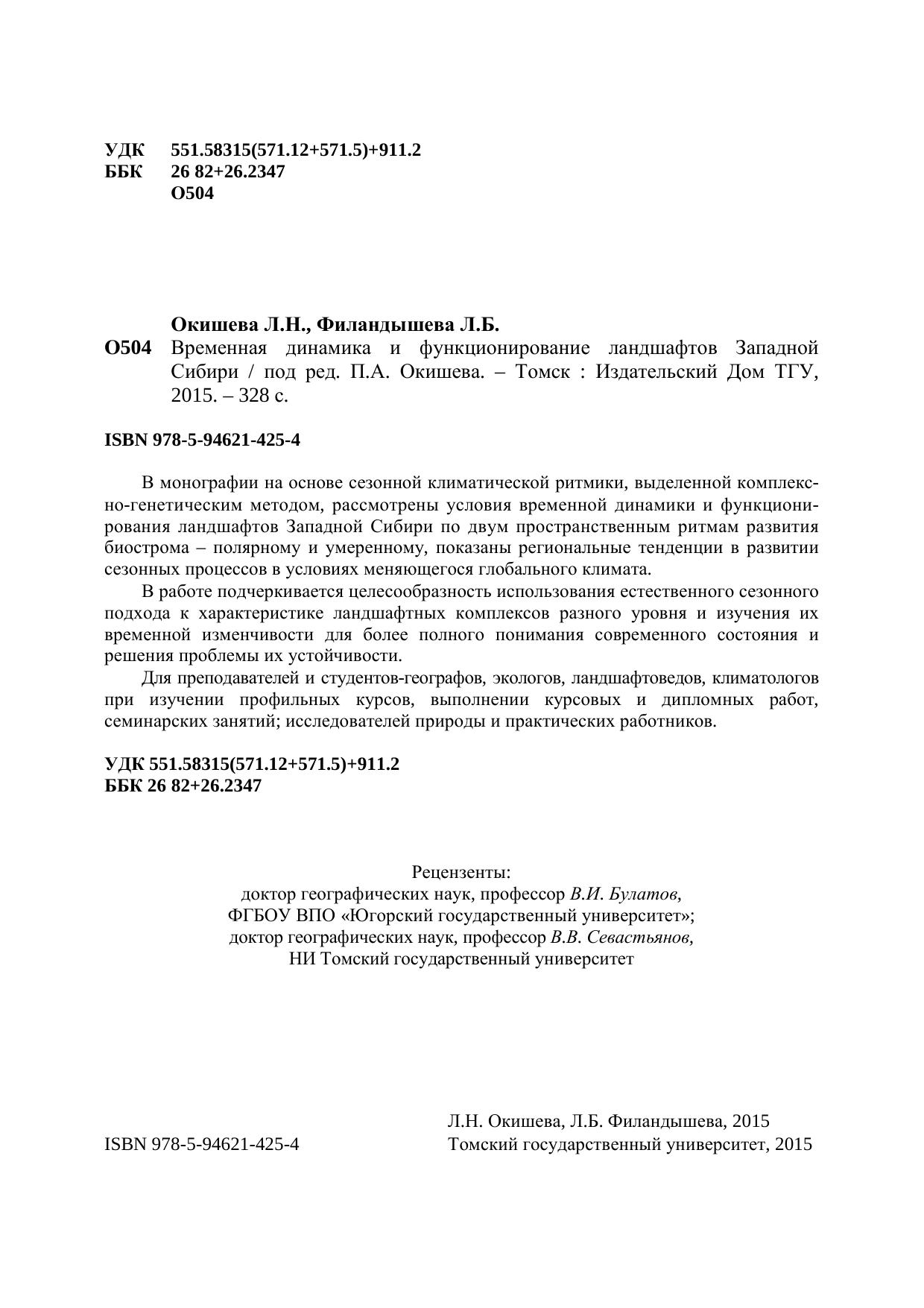 В монографии на основе сезонной климатической ритмики, выделенной комплексно-генетическим методом, рассмотрены условия временной динамики и функционирования ландшафтов Западной Сибири по двум пространственным ритмам развития биострома – полярному и умеренному, показаны региональные тенденции в развитии сезонных процессов в условиях меняющегося глобального климата. В работе подчеркивается целесообразность использования естественного сезонного подхода к характеристике ландшафтных комплексов разного уровня и изучения их временной изменчивости для более полного понимания современного состояния и решения проблемы их устойчивости. Для преподавателей и студентов-географов, экологов, ландшафтоведов, климатологов при изучении профильных курсов, выполнении курсовых и дипломных работ, семинарских занятий, исследователей природы и практических работников