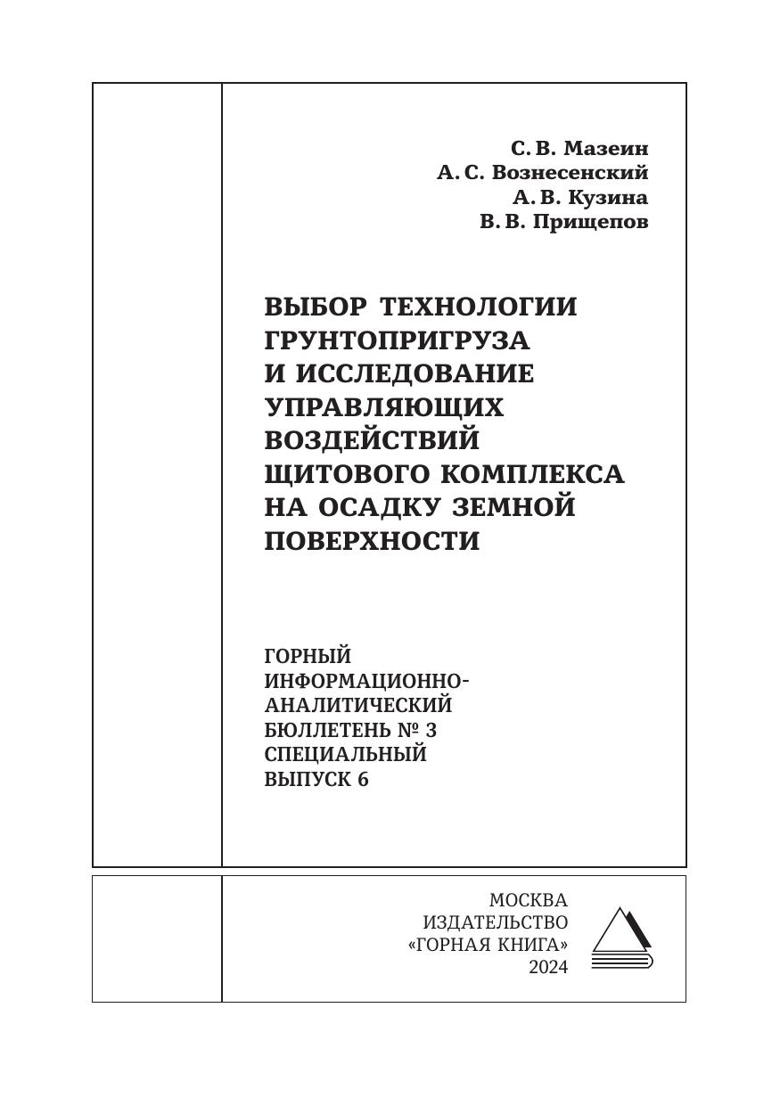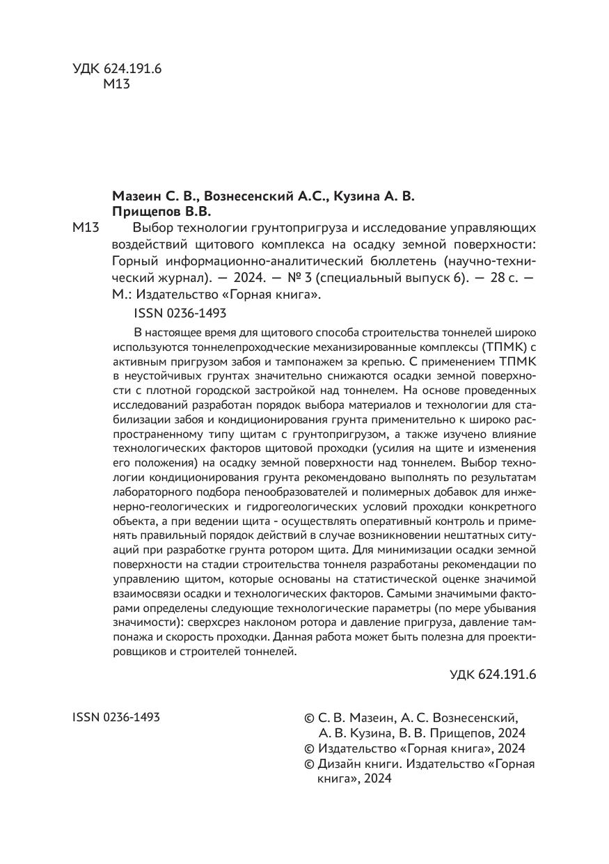 Выбор технологии грунтопригруза и исследование управляющих воздействий щитового комплекса на осадку земной поверхности: горный информационно-аналитический бюллетень № 3. Специальный выпуск 6