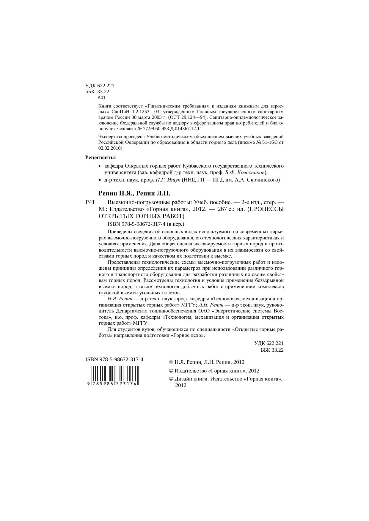 Приведены сведения об основных видах используемого на современных карьерах выемочно-погрузочного оборудования, его технологических характеристиках и условиях применения. Дана общая оценка экскавируемости горных пород и производительности выемочно-погрузочного оборудования в их взаимосвязи со свойствами горных пород и качеством их подготовки к выемке. Представлены технологические схемы выемочно-погрузочных работ и изложены принципы определения их параметров при использовании различного горного и транспортного оборудования для разработки различных по своим свойствам горных пород. Рассмотрены технология и условия применения безвзрывной выемки пород, а также технология добычных работ с применением комплексов глубокой выемки угольных пластов. Н.Я. Репин — д-р техн. наук, проф. кафедры «Технология, механизация и организация открытых горных работ» МГГУ; Л.Н. Репин — д-р экон. наук, руководитель Департамента топливообеспечения ОАО «Энергетические системы Востока», и.о. проф. кафедры «Технология, механизация и организация открытых горных работ» МГГУ. Для студентов вузов, обучающихся по специальности «Открытые горные работы» направления подготовки «Горное дело».