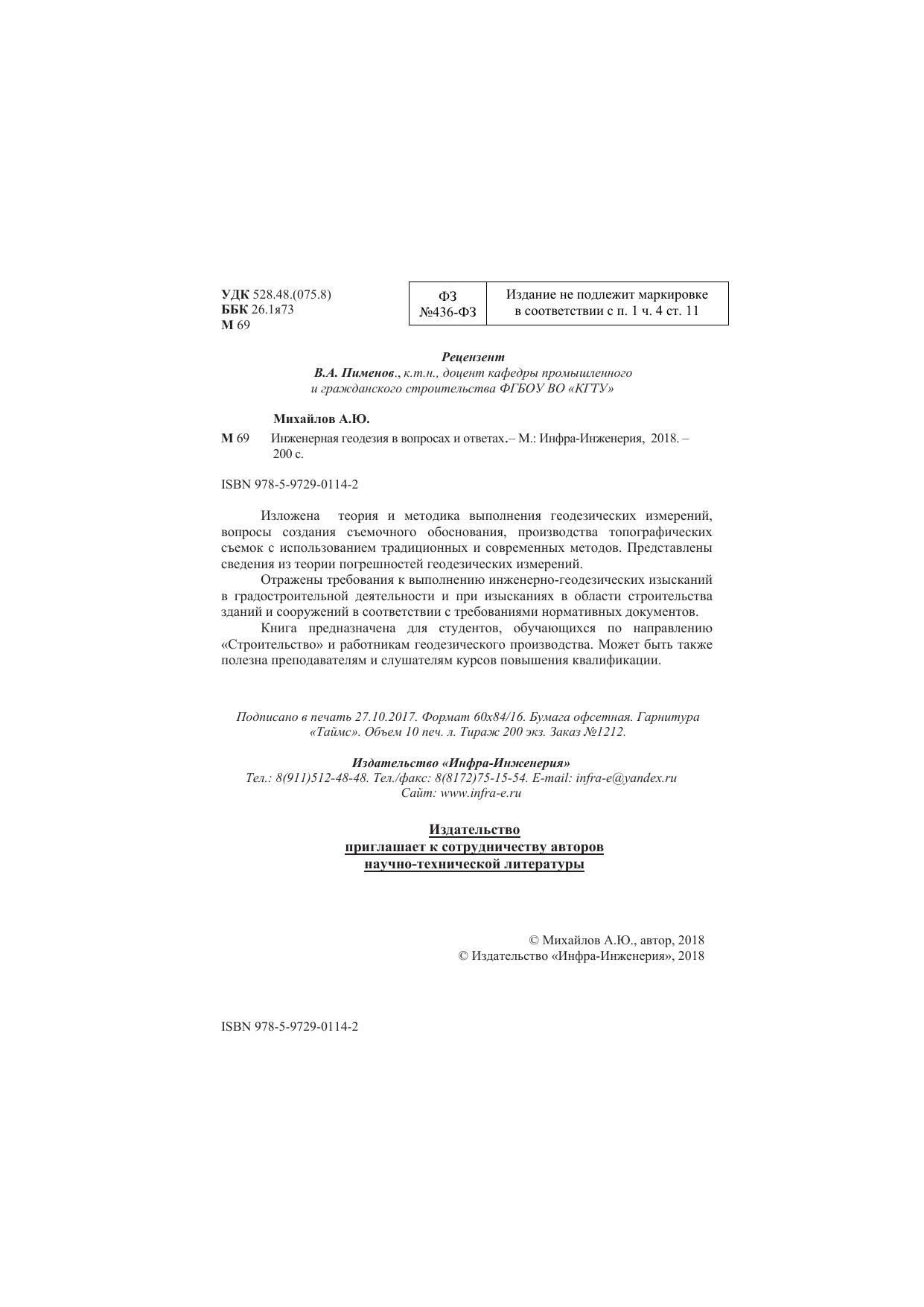 Книга предназначена для студентов, обучающихся по направлению «Строительство» и работникам геодезического производства. Может быть также полезна преподавателям и слушателям курсов повышения квалификации.
