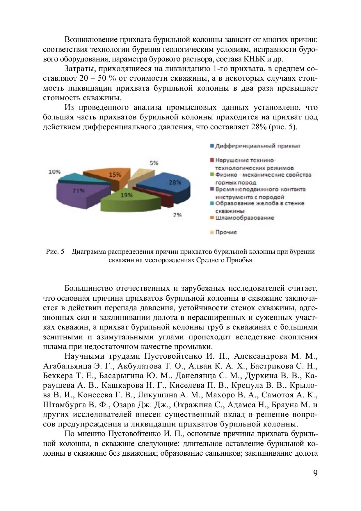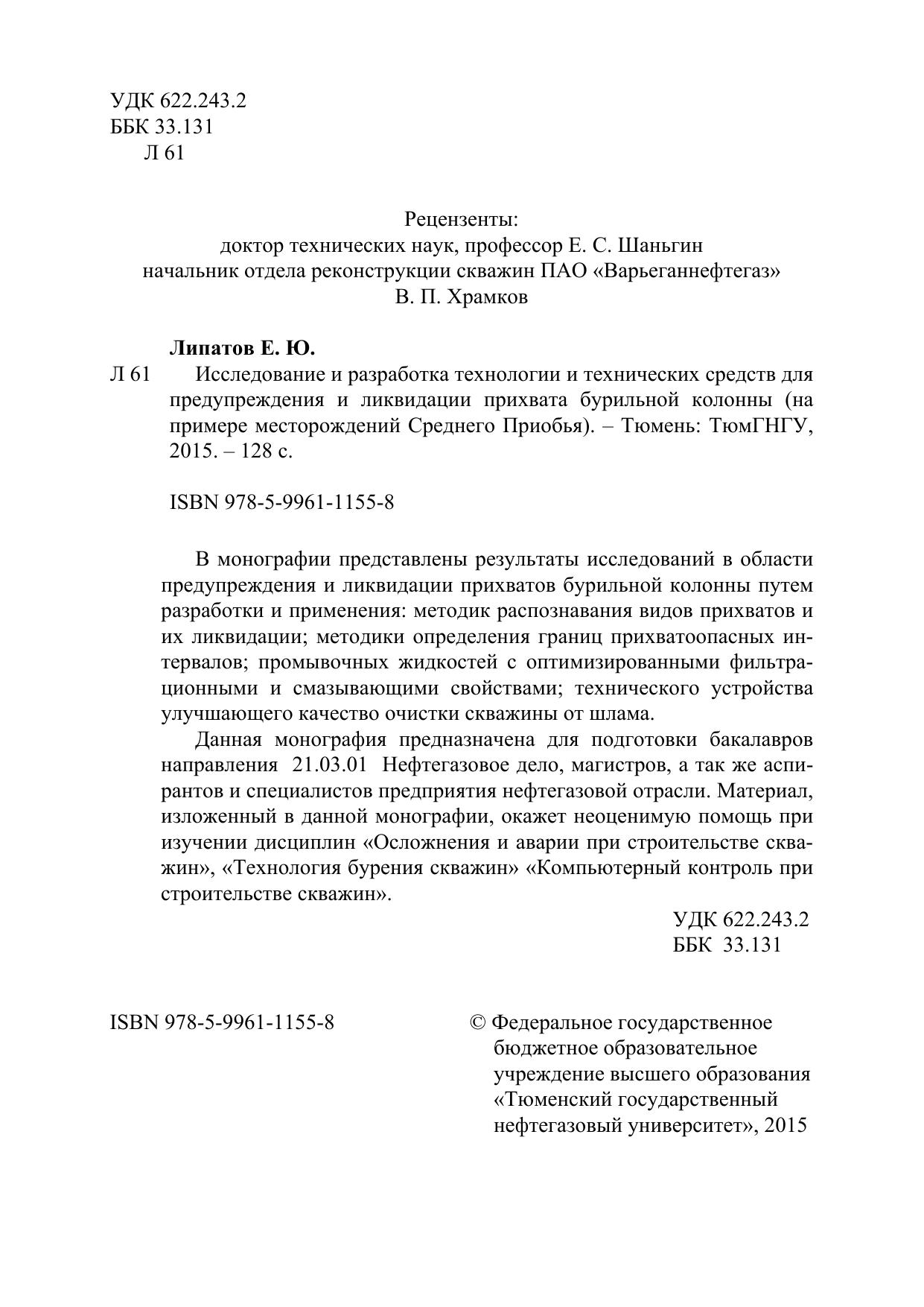 В монографии представлены результаты исследований в области предупреждения и ликвидации прихватов бурильной колонны путем разработки и применения: методик распознавания видов прихватов и их ликвидации; методики определения границ прихватоопасных интервалов; промывочных жидкостей с оптимизированными фильтрационными и смазывающими свойствами; технического устройства улучшающего качество очистки скважины от шлама. Данная монография предназначена для подготовки бакалавров направления 21.03.01 Нефтегазовое дело, магистров, а так же аспирантов и специалистов предприятия нефтегазовой отрасли. Материал, изложенный в данной монографии, окажет неоценимую помощь при изучении дисциплин «Осложнения и аварии при строительстве скважин», «Технология бурения скважин» «Компьютерный контроль при строительстве скважин».