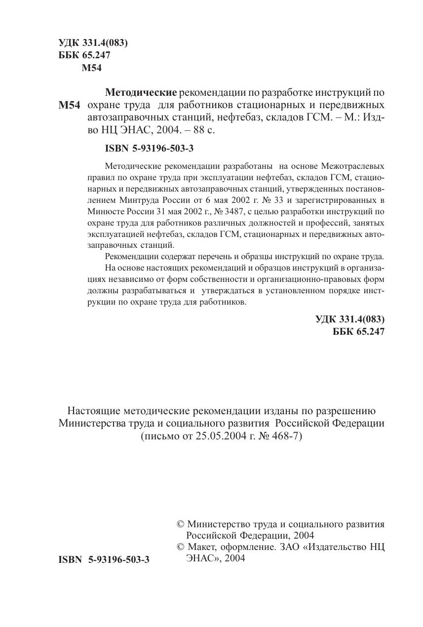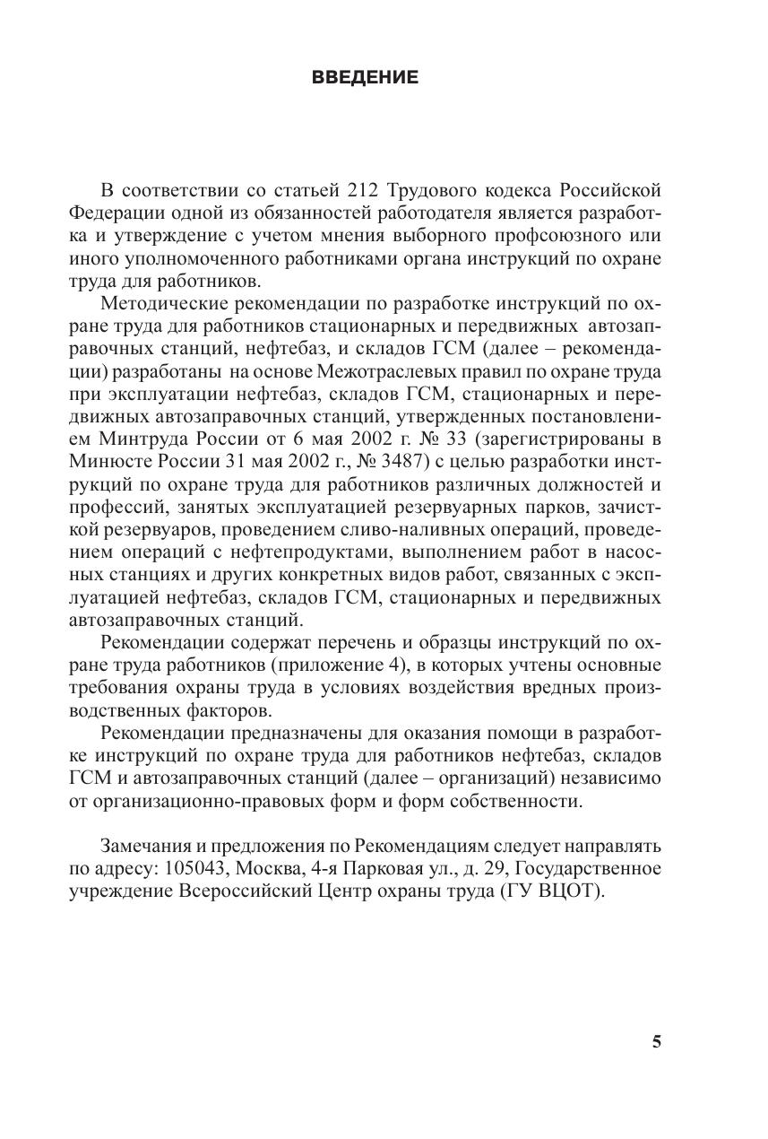 Методические рекомендации разработаны на основе Межотраслевых правил по охране труда при эксплуатации нефтебаз, складов ГСМ, стационарных и передвижных автозаправочных станций, утвержденных постановлением Минтруда России от 6 мая 2002 г. № 33 и зарегистрированных в Минюсте России 31 мая 2002 г., № 3487, с целью разработки инструкций по охране труда для работников различных должностей и профессий, занятых эксплуатацией нефтебаз, складов ГСМ, стационарных и передвижных автозаправочных станций. Рекомендации содержат перечень и образцы инструкций по охране труда.