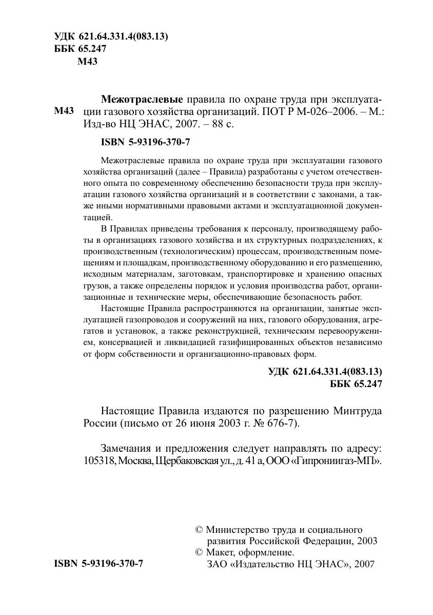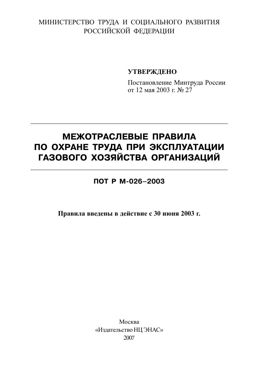 Межотраслевые правила по охране труда при эксплуатации газового хозяйства организаций. ПОТ Р М-026–2006
