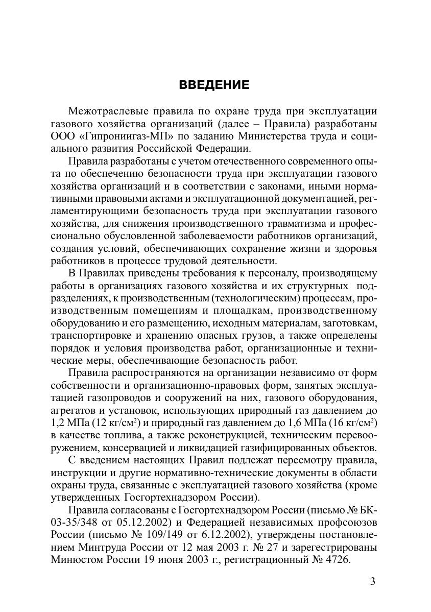Межотраслевые правила по охране труда при эксплуатации газового хозяйства организаций (далее – Правила) разработаны с учетом отечественного опыта по современному обеспечению безопасности труда при эксплуатации газового хозяйства организаций и в соответствии с законами, а также иными нормативными правовыми актами и эксплуатационной документацией. В Правилах приведены требования к персоналу, производящему работы в организациях газового хозяйства и их структурных подразделениях, к производственным (технологическим) процессам, производственным помещениям и площадкам, производственному оборудованию и его размещению, исходным материалам, заготовкам, транспортировке и хранению опасных грузов, а также определены порядок и условия производства работ, организационные и технические меры, обеспечивающие безопасность работ. Настоящие Правила распространяются на организации, занятые эксплуатацией газопроводов и сооружений на них, газового оборудования, агрегатов и установок, а также реконструкцией, техническим перевооружением, консервацией и ликвидацией газифицированных объектов независимо от форм собственности и организационно-правовых форм.