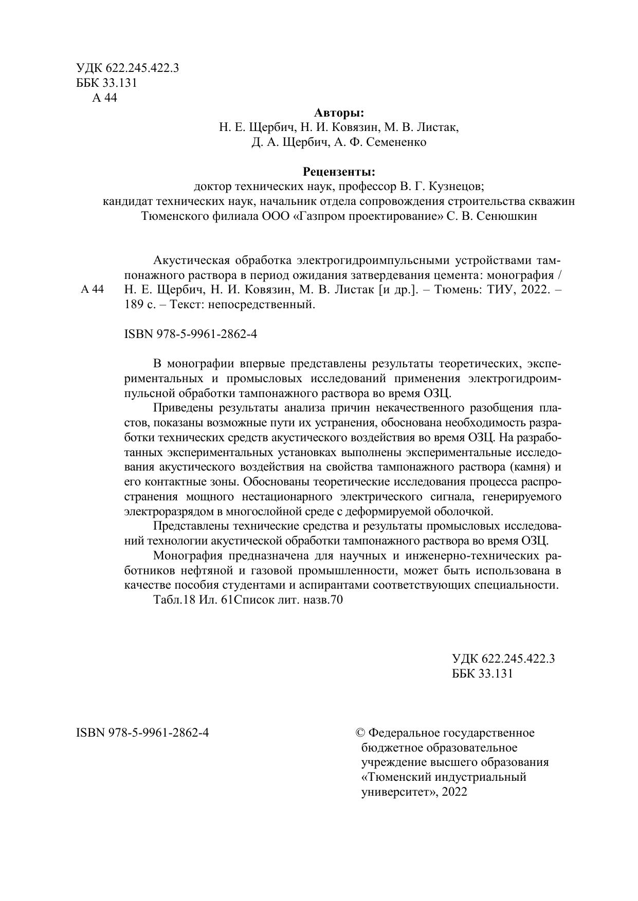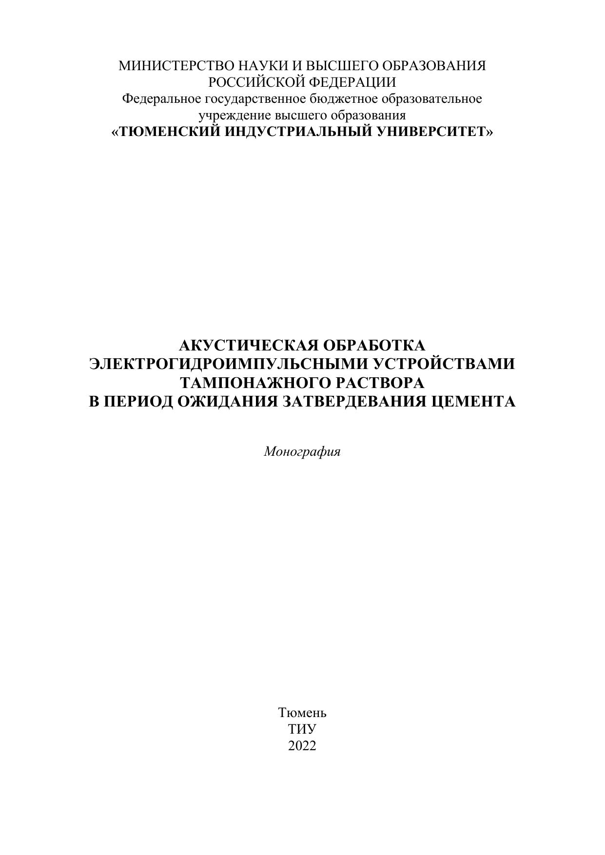 В монографии впервые представлены результаты теоретических, экспериментальных и промысловых исследований применения электрогидроимпульсной обработки тампонажного раствора во время ОЗЦ. Приведены результаты анализа причин некачественного разобщения пластов, показаны возможные пути их устранения, обоснована необходимость разработки технических средств акустического воздействия во время ОЗЦ. На разработанных экспериментальных установках выполнены экспериментальные исследования акустического воздействия на свойства тампонажного раствора (камня) и его контактные зоны. Обоснованы теоретические исследования процесса распространения мощного нестационарного электрического сигнала, генерируемого электроразрядом в многослойной среде с деформируемой оболочкой. Представлены технические средства и результаты промысловых исследований технологии акустической обработки тампонажного раствора во время ОЗЦ. Монография предназначена для научных и инженерно-технических работников нефтяной и газовой промышленности, может быть использована в качестве пособия студентами и аспирантами соответствующих специальности.