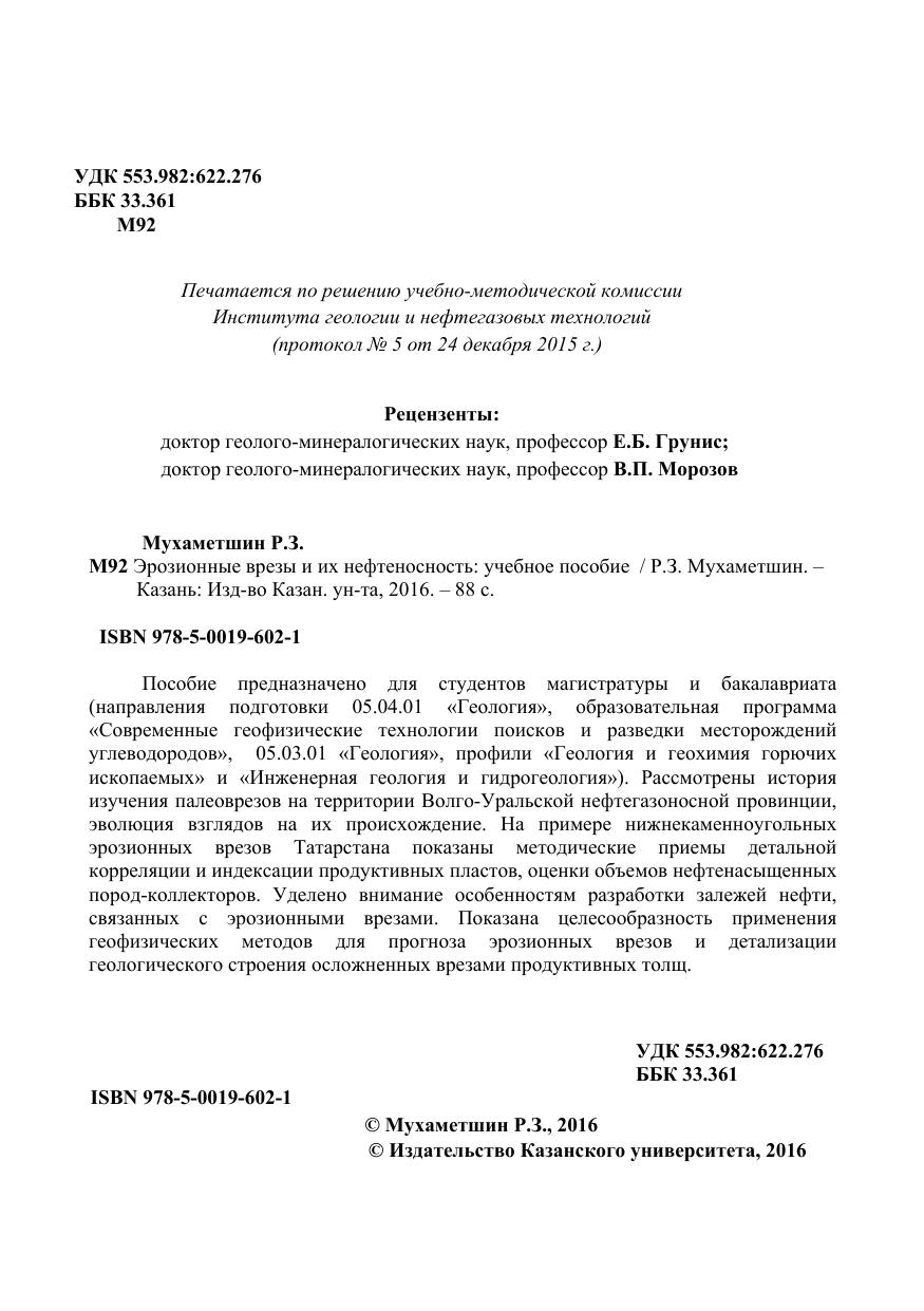Пособие предназначено для студентов магистратуры и бакалавриата (направления подготовки 05.04.01 «Геология», образовательная программа «Современные геофизические технологии поисков и разведки месторождений углеводородов», 05.03.01 «Геология», профили «Геология и геохимия горючих ископаемых» и «Инженерная геология и гидрогеология»). Рассмотрены история изучения палеоврезов на территории Волго-Уральской нефтегазоносной провинции, эволюция взглядов на их происхождение. На примере нижнекаменноугольных эрозионных врезов Татарстана показаны методические приемы детальной корреляции и индексации продуктивных пластов, оценки объемов нефтенасыщенных пород-коллекторов. Уделено внимание особенностям разработки залежей нефти, связанных с эрозионными врезами. Показана целесообразность применения геофизических методов для прогноза эрозионных врезов и детализации геологического строения осложненных врезами продуктивных толщ.