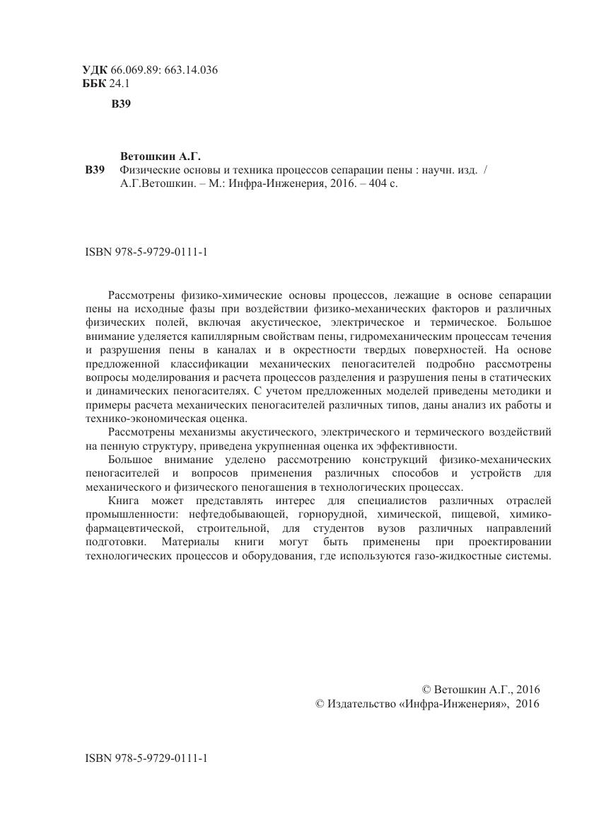 Рассмотрены физико-химические основы процессов, лежащие в основе сепарации пены на исходные фазы при воздействии физико-механических факторов и различных физических полей, включая акустическое, электрическое и термическое. Большое внимание уделяется капиллярным свойствам пены, гидромеханическим процессам течения и разрушения пены в каналах и в окрестности твердых поверхностей. На основе предложенной классификации механических пеногасителей подробно рассмотрены вопросы моделирования и расчета процессов разделения и разрушения пены в статических и динамических пеногасителях. С учетом предложенных моделей приведены методики и примеры расчета механических пеногасителей различных типов, даны анализ их работы и технико-экономическая оценка. Рассмотрены механизмы акустического, электрического и термического воздействий на пенную структуру, приведена укрупненная оценка их эффективности.