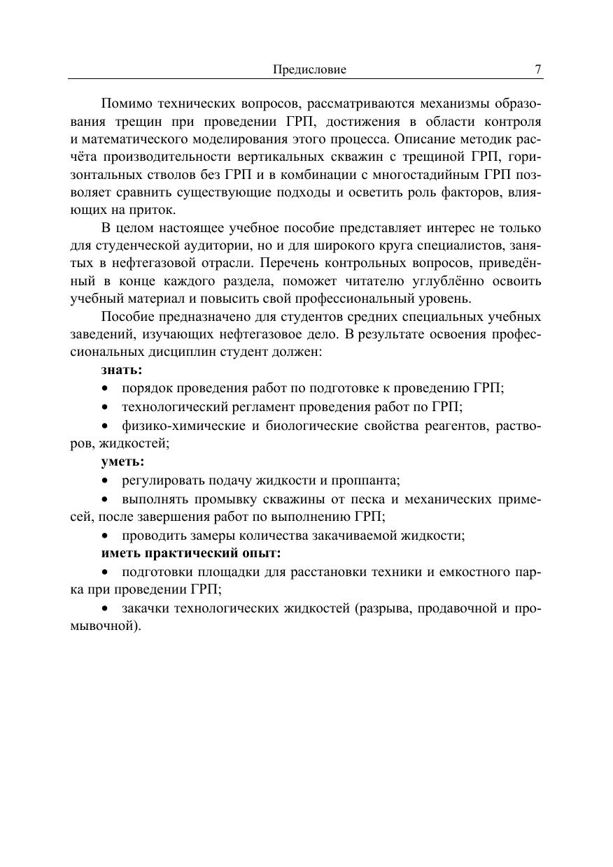 Рассмотрены принципы стимулирования притока нефти к скважинам путём проведения в них гидравлического разрыва пласта (ГРП). Описаны ГРП в вертикальных скважинах, варианты заканчивания горизонтальных стволов, технологии многостадийного ГРП, способы расчёта производительности скважин с трещиной ГРП. Соответствует современным требованиям ФГОС СПО и профессиональным квалификационным требованиям. Пособие предназначено для студентов средних специальных учебных заведений, изучающих нефтегазовое дело.