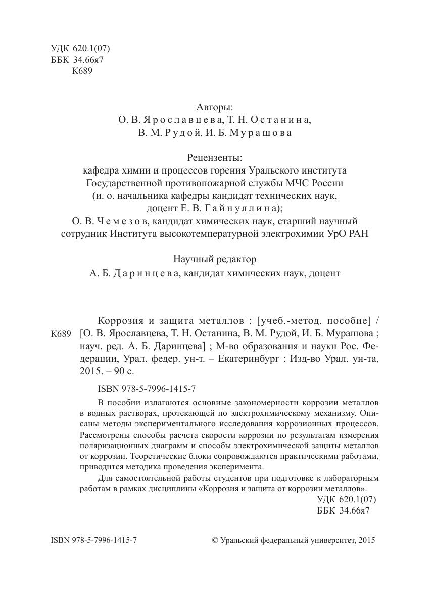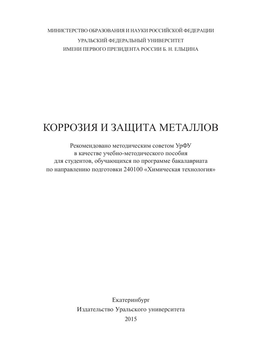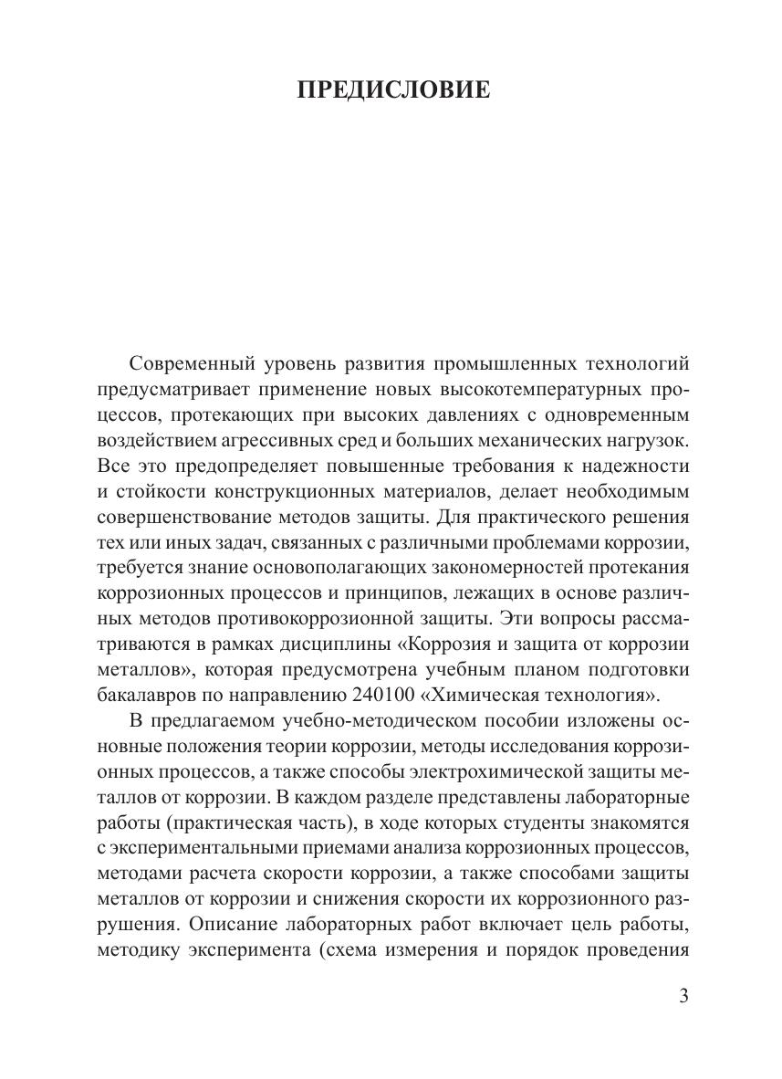 В пособии излагаются основные закономерности коррозии металлов в водных растворах, протекающей по электрохимическому механизму. Описаны методы экспериментального исследования коррозионных процессов. Рассмотрены способы расчета скорости коррозии по результатам измерения поляризационных диаграмм и способы электрохимической защиты металлов от коррозии. Теоретические блоки сопровождаются практическими работами, приводится методика проведения эксперимента. Для самостоятельной работы студентов при подготовке к лабораторным работам в рамках дисциплины «Коррозия и защита от коррозии металлов».