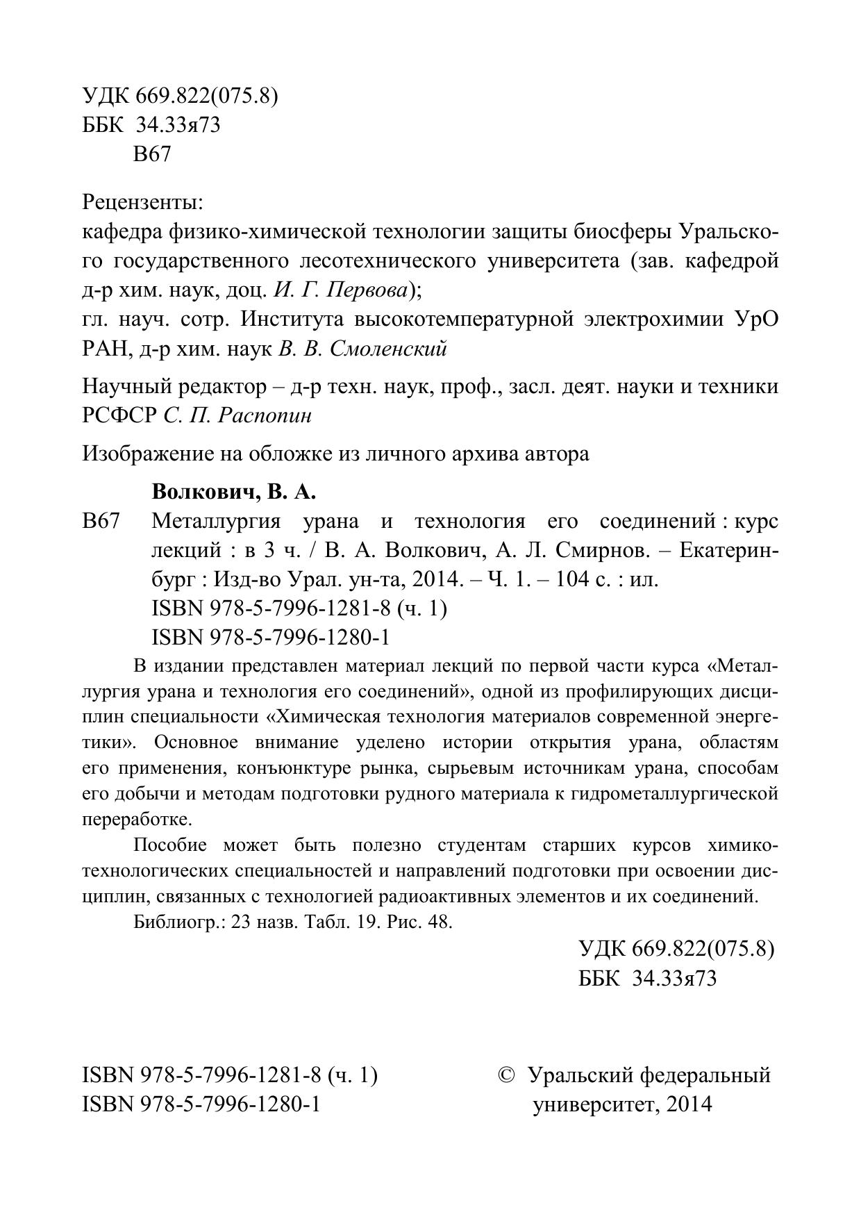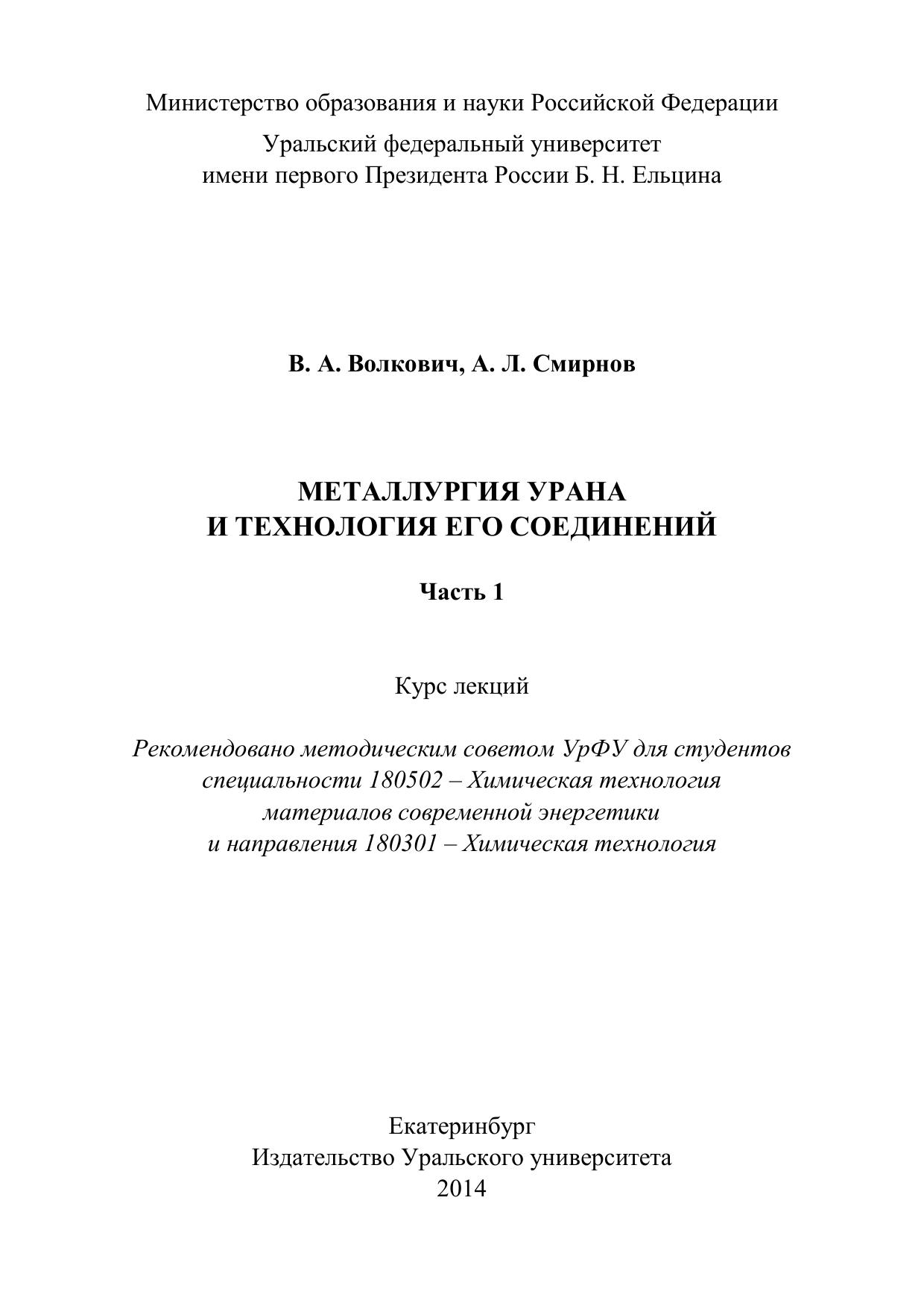 Металлургия урана и технология его соединений : курс лекций : в 3 ч. Ч. 1