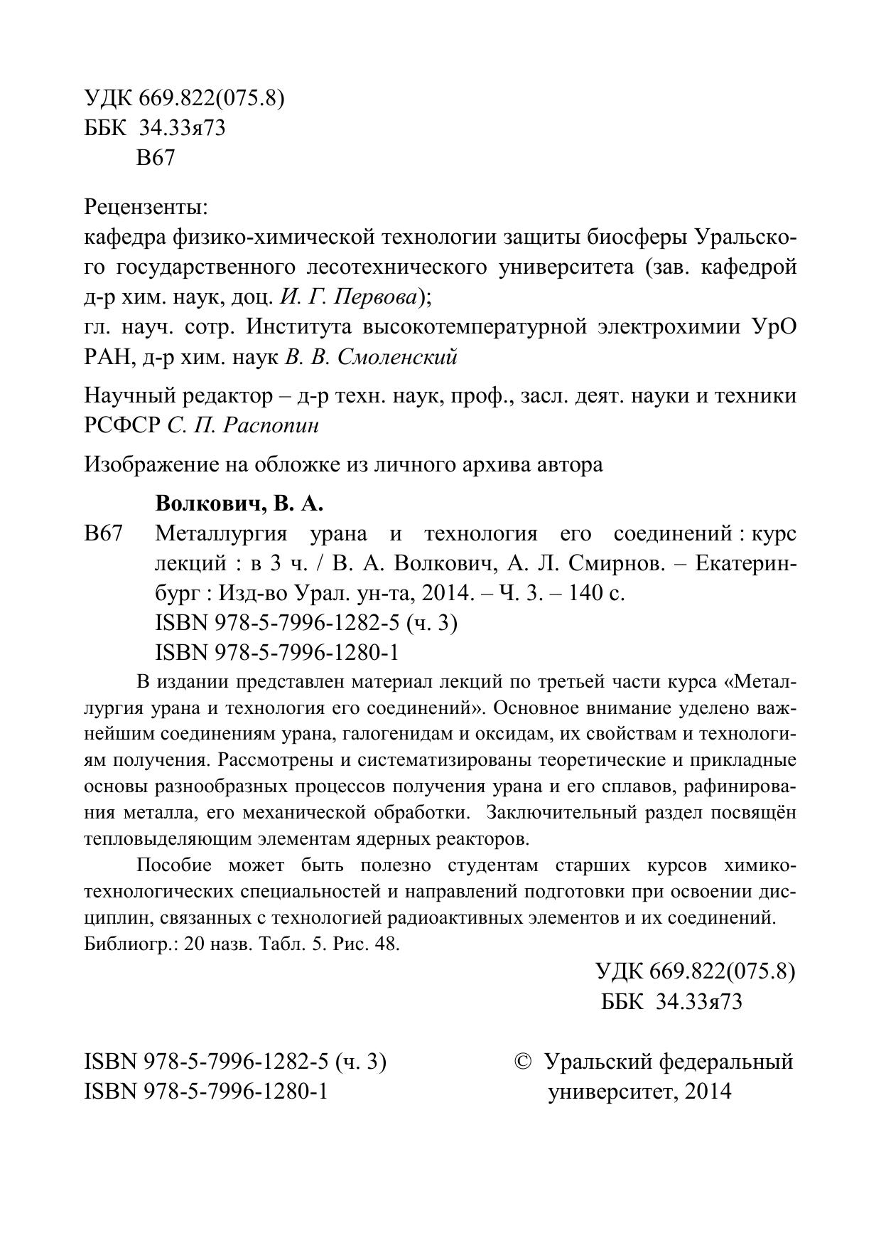 В издании представлен материал лекций по третьей части курса «Металлургия урана и технология его соединений». Основное внимание уделено важнейшим соединениям урана, галогенидам и оксидам, их свойствам и технологиям получения. Рассмотрены и систематизированы теоретические и прикладные основы разнообразных процессов получения урана и его сплавов, рафинирования металла, его механической обработки. Заключительный раздел посвящён тепловыделяющим элементам ядерных реакторов. Пособие может быть полезно студентам старших курсов химикотехнологических специальностей и направлений подготовки при освоении дисциплин, связанных с технологией радиоактивных элементов и их соединений.