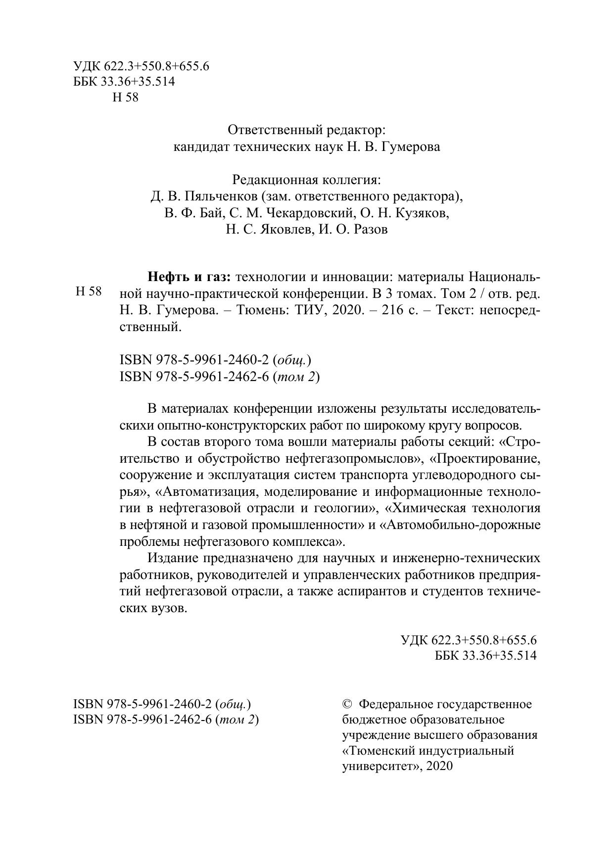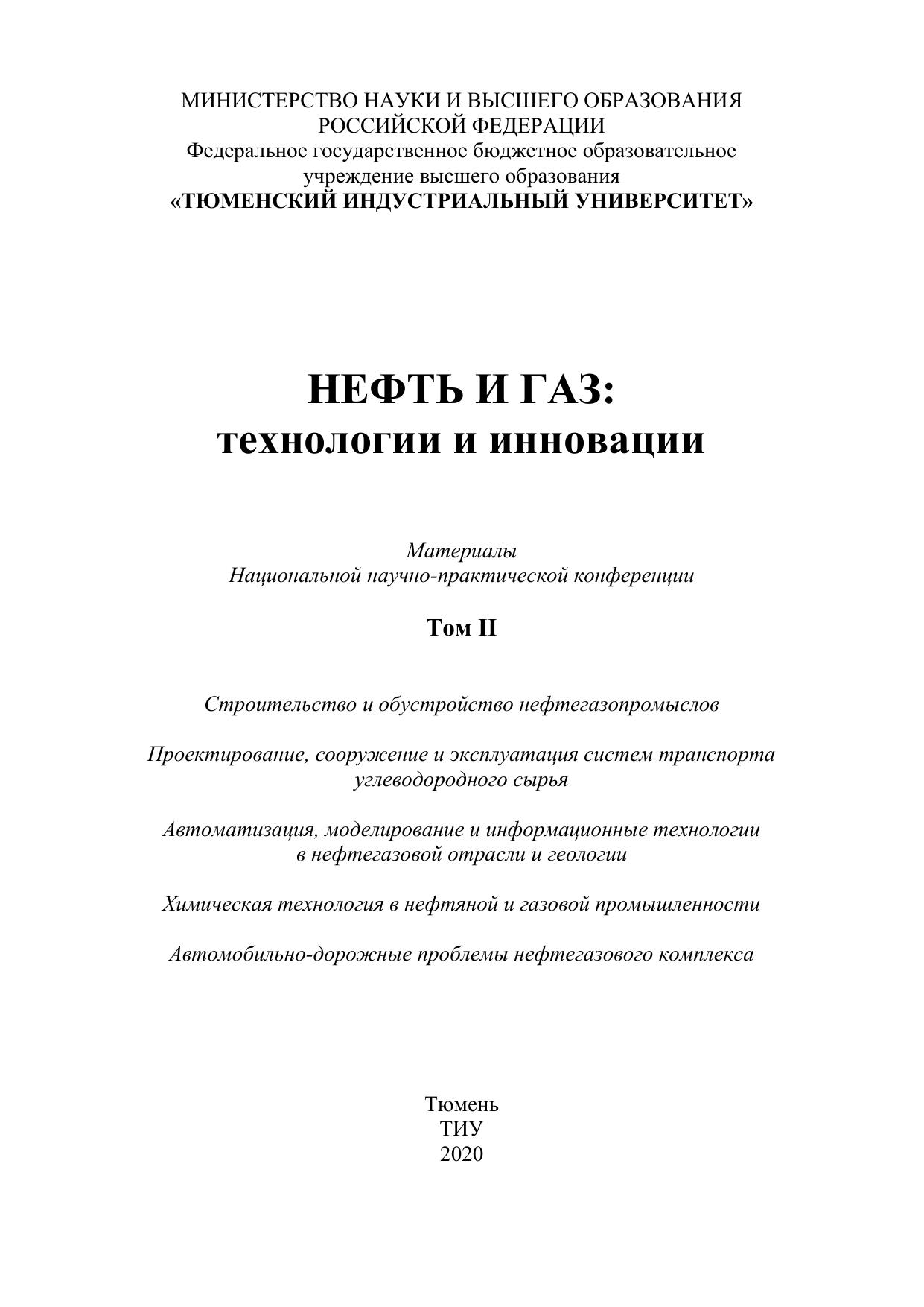 В материалах конференции изложены результаты исследовательских и опытно-конструкторских работ по широкому кругу вопросов. В состав второго тома вошли материалы работы секций: «Строительство и обустройство нефтегазо-промыслов», «Проектирование, сооружение и эксплуатация систем транспорта углеводородного сырья», «Автоматизация, моделирование и информационные технологии в нефтегазовой отрасли и геологии», «Химическая технология в нефтяной и газовой промышленности» и «Автомобильно-дорожные проблемы нефтегазового комплекса». Издание предназначено для научных и инженерно-технических работников, руководителей и управленческих работников предприятий нефтегазовой отрасли, а также аспирантов и студентов технических вузов.