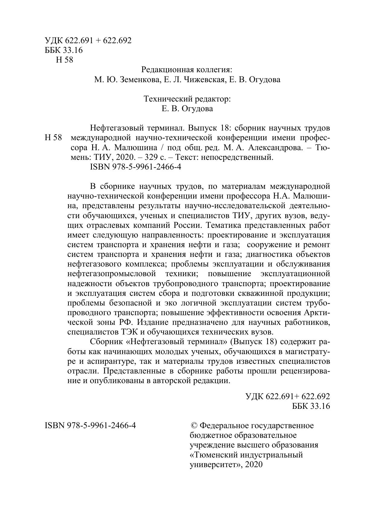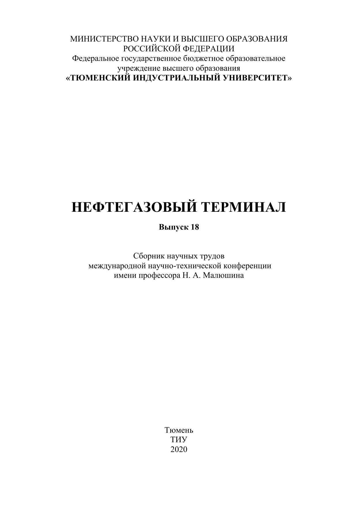 В сборнике научных трудов, по материалам международной научно-технической конференции имени профессора Н.А. Малюшина, представлены результаты научно-исследовательской деятельности обучающихся, ученых и специалистов ТИУ, других вузов, ведущих отраслевых компаний России. Тематика представленных работ имеет следующую направленность: проектирование и эксплуатация систем транспорта и хранения нефти и газа; сооружение и ремонт систем транспорта и хранения нефти и газа; диагностика объектов нефтегазового комплекса; проблемы эксплуатации и обслуживания нефтегазопромысловой техники; повышение эксплуатационной надежности объектов трубопроводного транспорта; проектирование и эксплуатация систем сбора и подготовки скважинной продукции; проблемы безопасной и эко логичной эксплуатации систем трубопроводного транспорта; повышение эффективности освоения Арктической зоны РФ. Издание предназначено для научных работников, специалистов ТЭК и обучающихся технических вузов. Сборник «Нефтегазовый терминал» (Выпуск 18) содержит работы как начинающих молодых ученых, обучающихся в магистрату-ре и аспирантуре, так и материалы трудов известных специалистов отрасли. Представленные в сборнике работы прошли рецензирование и опубликованы в авторской редакции.