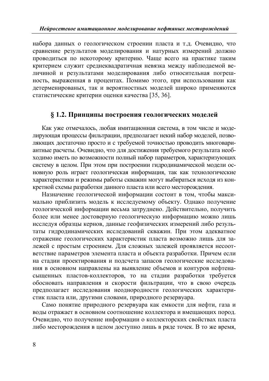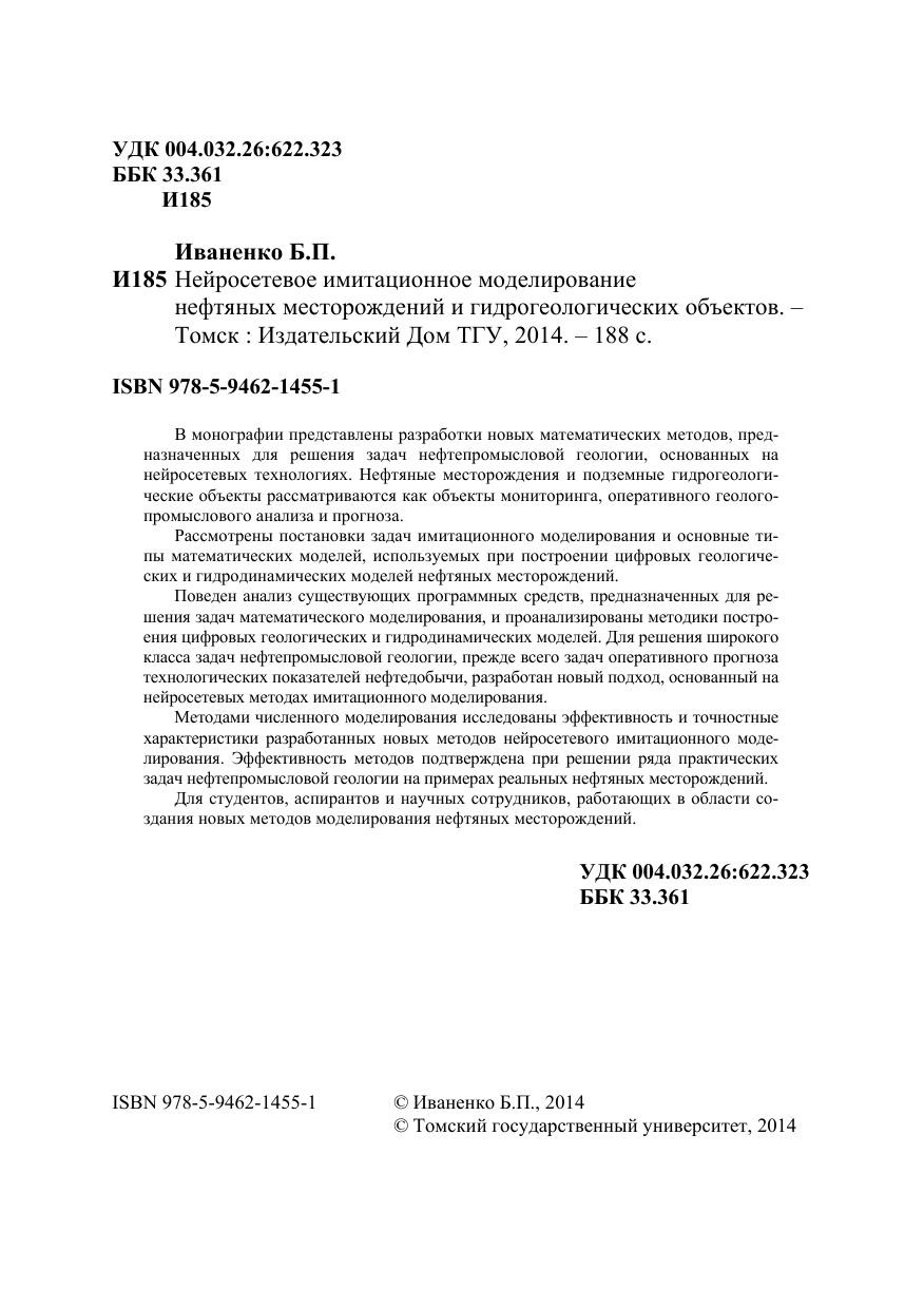 В монографии представлены разработки новых математических методов, предназначенных для решения задач нефтепромысловой геологии, основанных на нейросетевых технологиях. Нефтяные месторождения и подземные гидрогеологические объекты рассматриваются как объекты мониторинга, оперативного геологопромыслового анализа и прогноза. Рассмотрены постановки задач имитационного моделирования и основные типы математических моделей, используемых при построении цифровых геологических и гидродинамических моделей нефтяных месторождений. Поведен анализ существующих программных средств, предназначенных для решения задач математического моделирования, и проанализированы методики построения цифровых геологических и гидродинамических моделей. Для решения широкого класса задач нефтепромысловой геологии, прежде всего задач оперативного прогноза технологических показателей нефтедобычи, разработан новый подход, основанный на нейросетевых методах имитационного моделирования. Методами численного моделирования исследованы эффективность и точностные характеристики разработанных новых методов нейросетевого имитационного моделирования. Эффективность методов подтверждена при решении ряда практических задач нефтепромысловой геологии на примерах реальных нефтяных месторождений. Для студентов, аспирантов и научных сотрудников, работающих в области создания новых методов моделирования нефтяных месторождений.