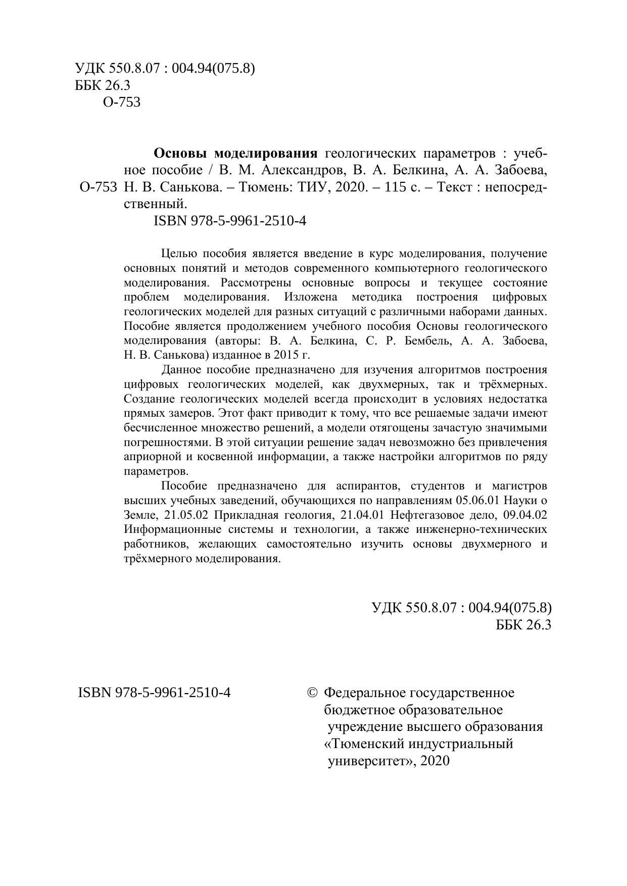 Целью пособия является введение в курс моделирования, получение основных понятий и методов современного компьютерного геологического моделирования. Рассмотрены основные вопросы и текущее состояние проблем моделирования. Изложена методика построения цифровых геологических моделей для разных ситуаций с различными наборами данных. Пособие является продолжением учебного пособия Основы геологического моделирования (авторы: В. А. Белкина, С. Р. Бембель, А. А. Забоева, Н. В. Санькова) изданное в 2015 г. Данное пособие предназначено для изучения алгоритмов построения цифровых геологических моделей, как двухмерных, так и трёхмерных. Создание геологических моделей всегда происходит в условиях недостатка прямых замеров. Этот факт приводит к тому, что все решаемые задачи имеют бесчисленное множество решений, а модели отягощены зачастую значимыми погрешностями. В этой ситуации решение задач невозможно без привлечения априорной и косвенной информации, а также настройки алгоритмов по ряду параметров. Пособие предназначено для аспирантов, студентов и магистров высших учебных заведений, обучающихся по направлениям 05.06.01 Науки о Земле, 21.05.02 Прикладная геология, 21.04.01 Нефтегазовое дело, 09.04.02 Информационные системы и технологии, а также инженерно-технических работников, желающих самостоятельно изучить основы двухмерного и трёхмерного моделирования