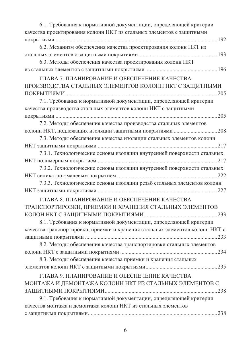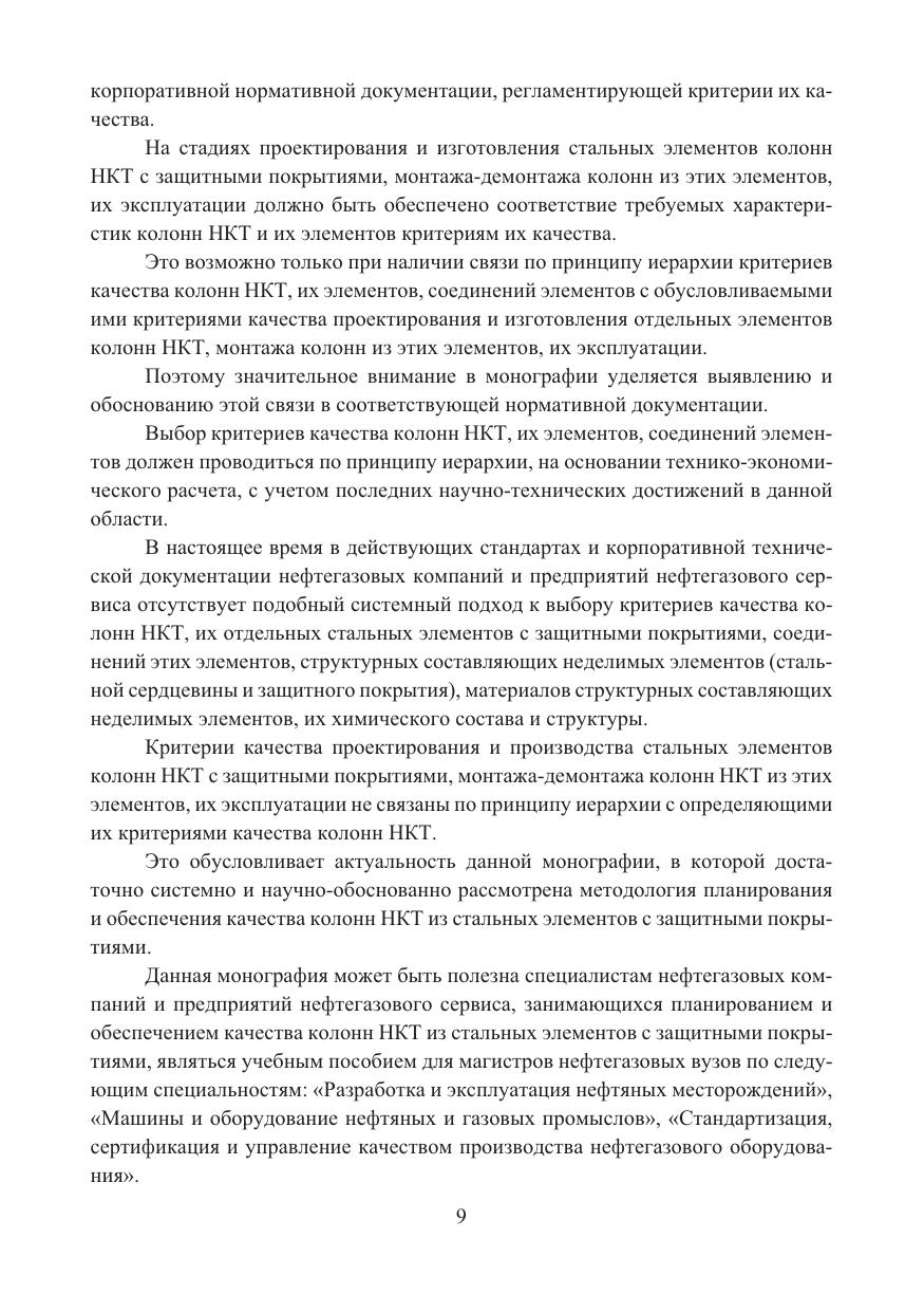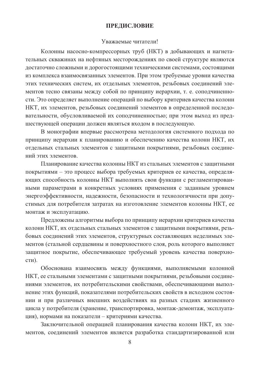 Рассмотрена сущность понятий «качество», «критерии качества», «планирование качества» колонн НКТ из стальных элементов с защитными покрытиями. Проанализирована взаимосвязь критериев качества колонн НКТ, их отдельных элементов, соединений этих элементов, структурных составляющих неделимых элементов. Приведены алгоритмы выбора критериев качества колонн НКТ, их элементов, соединений элементов. Рассмотрены конструктивные особенности колонн НКТ из стальных элементов с защитными покрытиями, особенности их проектирования, изготовления отдельных элементов, транспортировки, приемки, хранения, монтажа и демонтажа, эксплуатации.