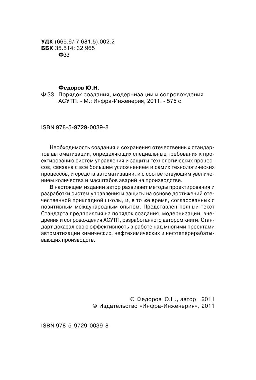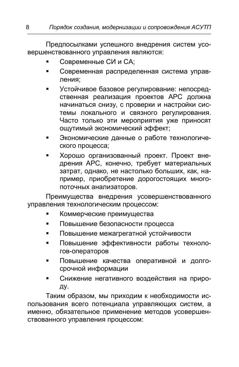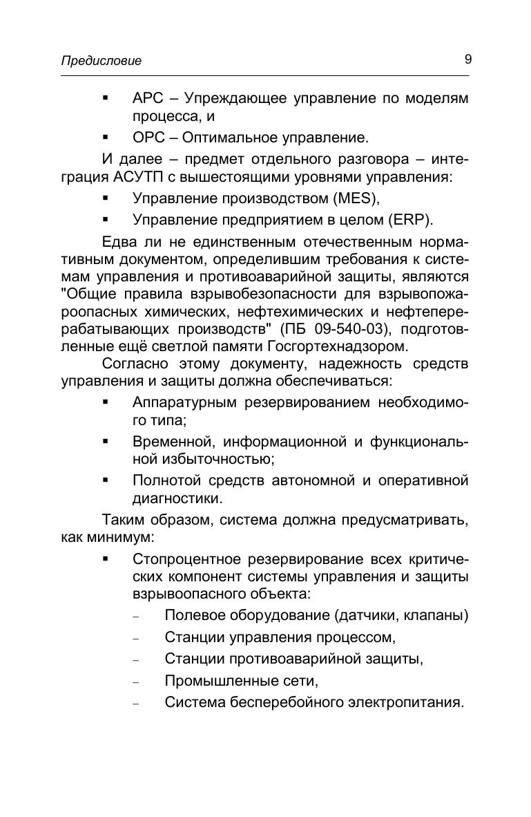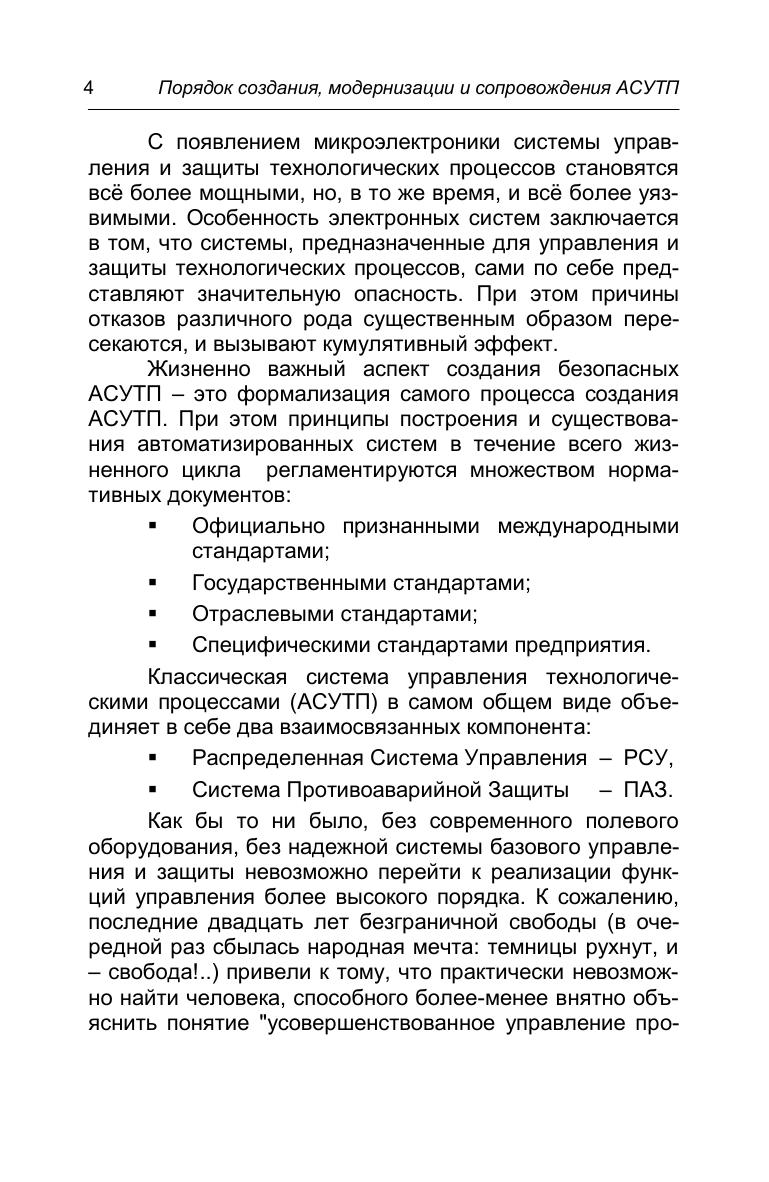 Необходимость создания и сохранения отечественных стандартов автоматизации, определяющих специальные требования к проектированию систем управления и защиты технологических процессов, связана с все большим усложнением и самих технологических процессов, и средств автоматизации, и с соответствующим увеличением количества и масштабов аварий на производстве. В настоящем издании автор развивает методы проектирования и разработки систем управления и защиты на основе достижений отечественной прикладной школы, и, в то же время, согласованных с позитивным международным опытом. Представлен полный текст Стандарта предприятия на порядок создания, модернизации, внедрения и сопровождения АСУТП, разработанного автором книги. Стандарт доказал свою эффективность в работе над многими проектами автоматизации химических, нефтехимических и нефтеперерабатывающих производств.