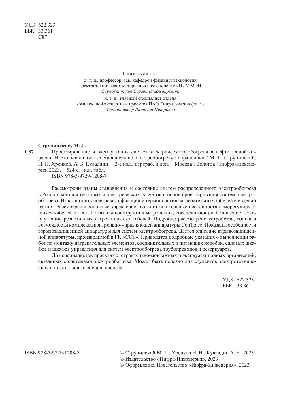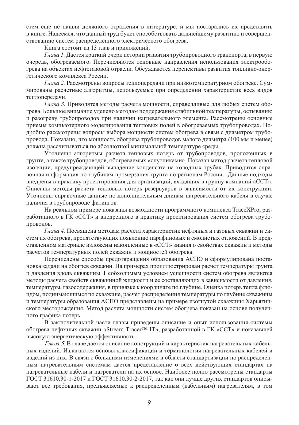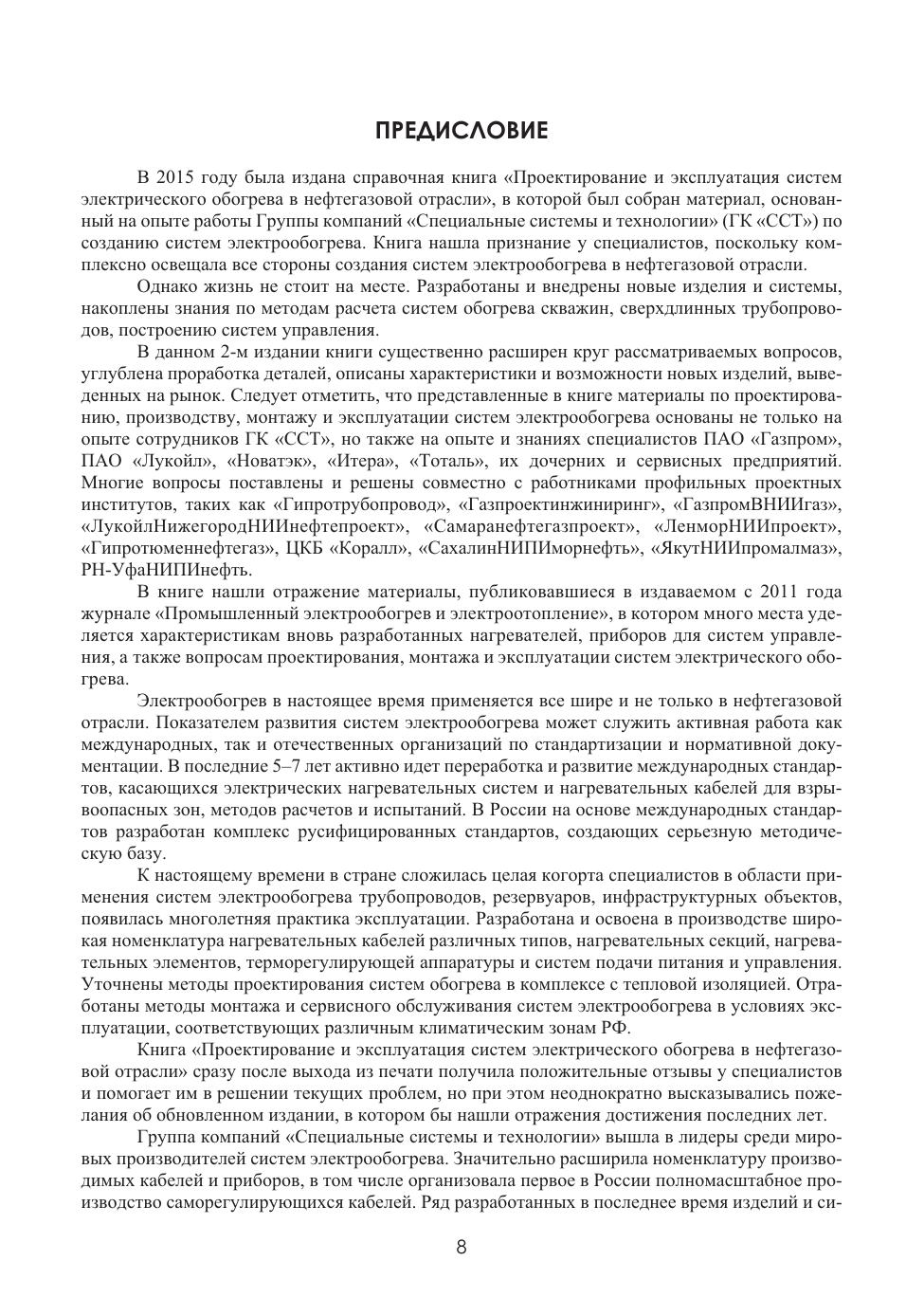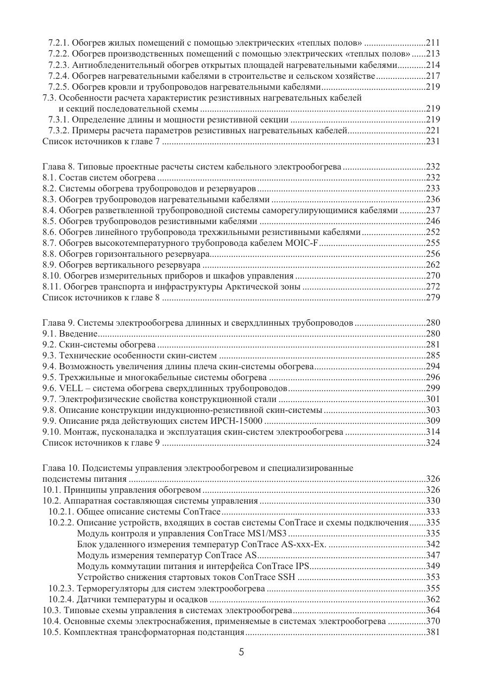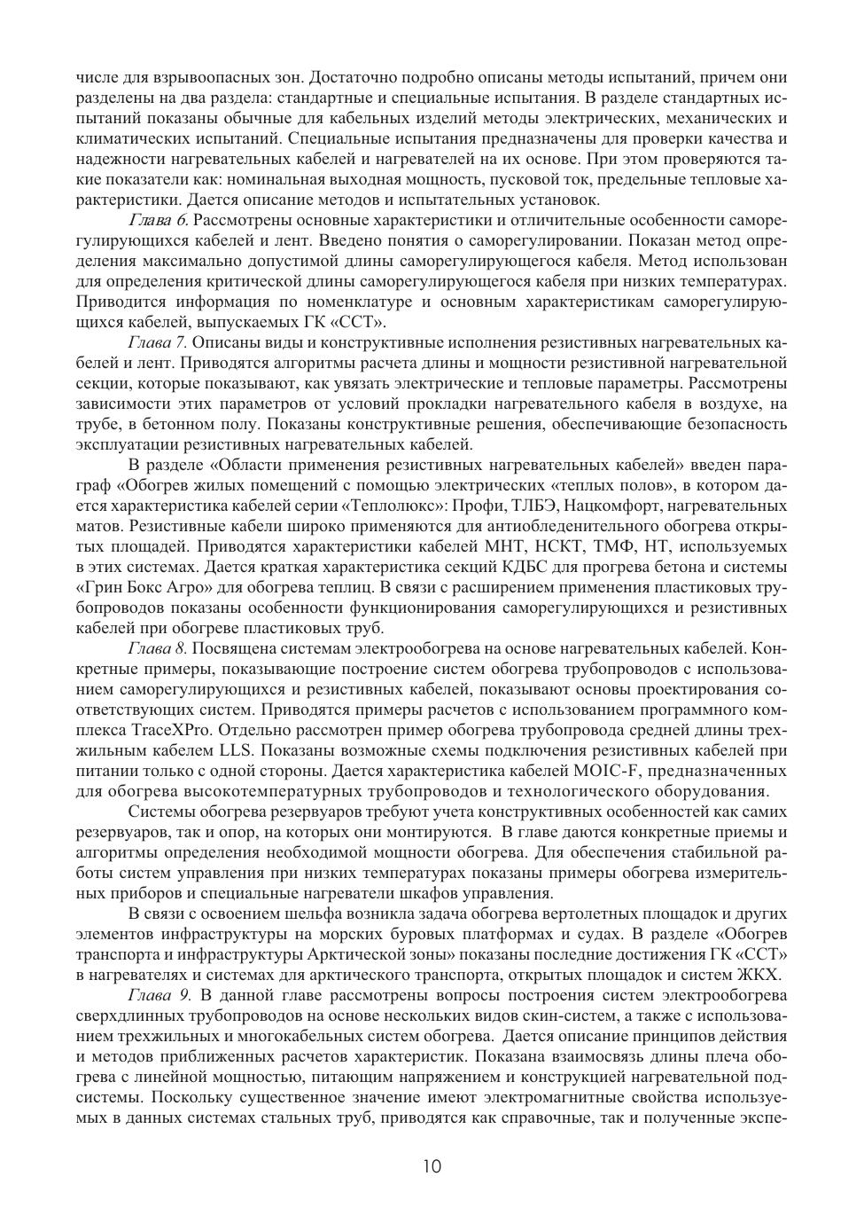 Рассмотрены этапы становления и состояние систем распределенного электрообогрева в России; методы тепловых и электрических расчетов и основ проектирования систем электрообогрева. Излагаются основы классификации и терминология нагревательных кабелей и изделий из них. Рассмотрены основные характеристики и отличительные особенности саморегулирующихся кабелей и лент. Показаны конструктивные решения, обеспечивающие безопасность эксплуатации резистивных нагревательных кабелей. Подробно рассмотрено устройство, состав и возможности комплекса контрольно-управляющей аппаратуры ConTrace. Показаны особенности взрывозащищенной аппаратуры для систем электрообогрева. Дается описание взрывозащищенной аппаратуры, производимой в ГК «ССТ». Приводятся подробные указания о выполнении работ по монтажу нагревательных элементов, соединительных и питающих коробок, силовых шкафов и шкафов управления для систем электрообогрева трубопроводов и резервуаров.
