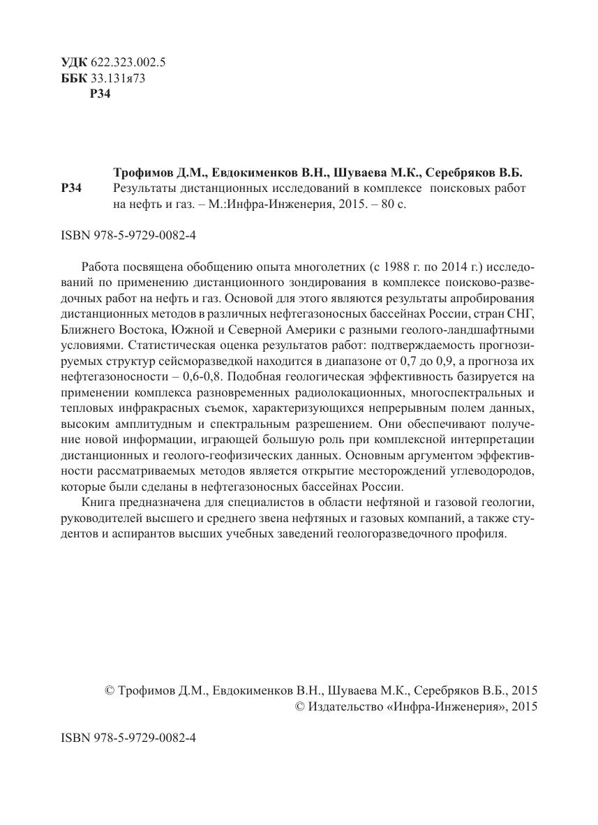 Работа посвящена обобщению опыта многолетних (с 1988 г. по 2014 г.) исследований по применению дистанционного зондирования в комплексе поисково-разведочных работ на нефть и газ. Основой для этого являются результаты апробированиядистанционных методов в различных нефтегазоносных бассейнах России, стран СНГ, Ближнего Востока, Южной и Северной Америки с разными геолого-ландшафтными условиями. Статистическая оценка результатов работ: подтверждаемость прогнозируемых структур сейсморазведкой находится в диапазоне от 0,7 до 0,9, а прогноза их нефтегазоносности – 0,6-0,8. Подобная геологическая эффективность базируется на применении комплекса разновременных радиолокационных, многоспектральных и тепловых инфракрасных съемок, характеризующихся непрерывным полем данных, высоким амплитудным и спектральным разрешением. Они обеспечивают получение новой информации, играющей большую роль при комплексной интерпретации дистанционных и геолого-геофизических данных. Основным аргументом эффективности рассматриваемых методов является открытие месторождений углеводородов, которые были сделаны в нефтегазоносных бассейнах России. Книга предназначена для специалистов в области нефтяной и газовой геологии, руководителей высшего и среднего звена нефтяных и газовых компаний, а также студентов и аспирантов высших учебных заведений геологоразведочного профиля.