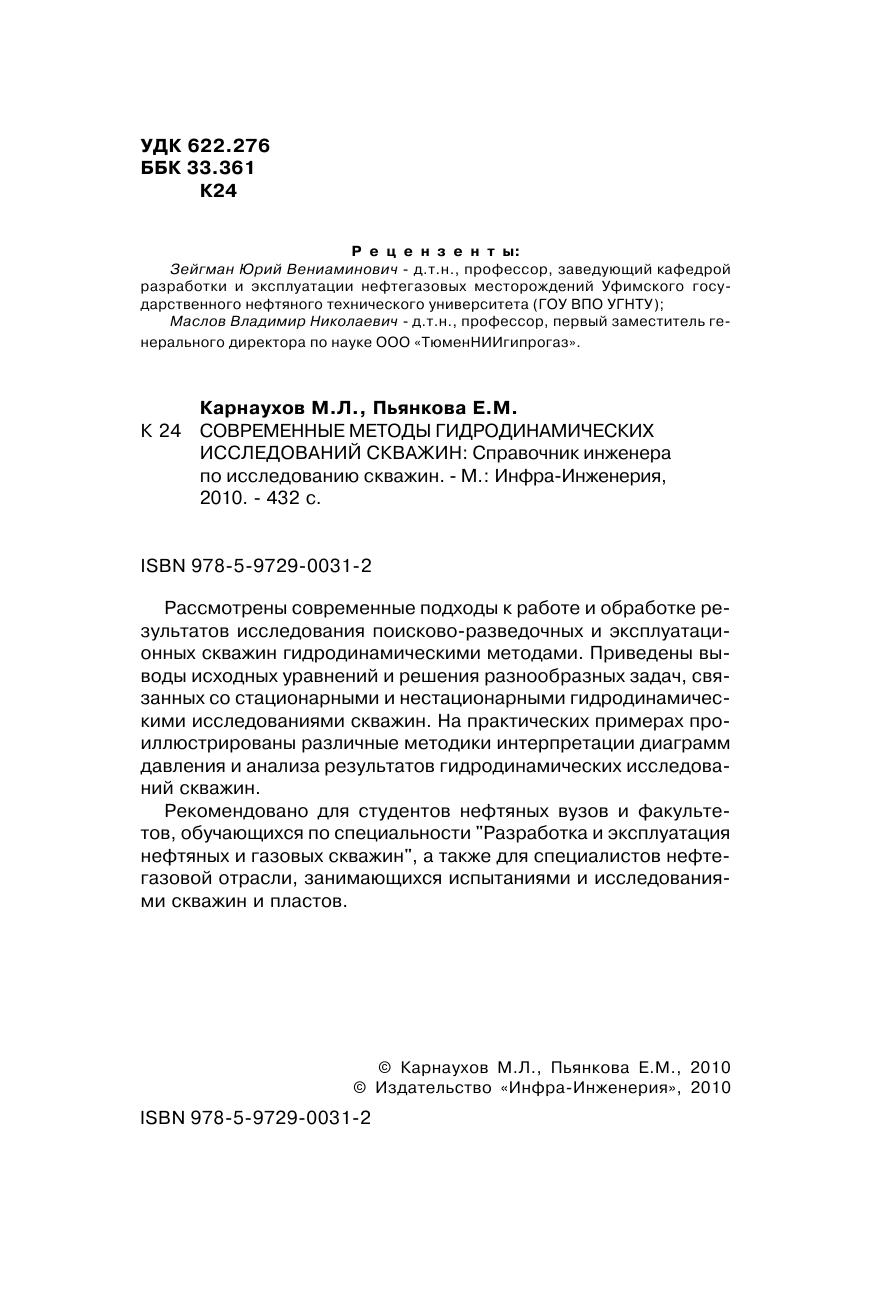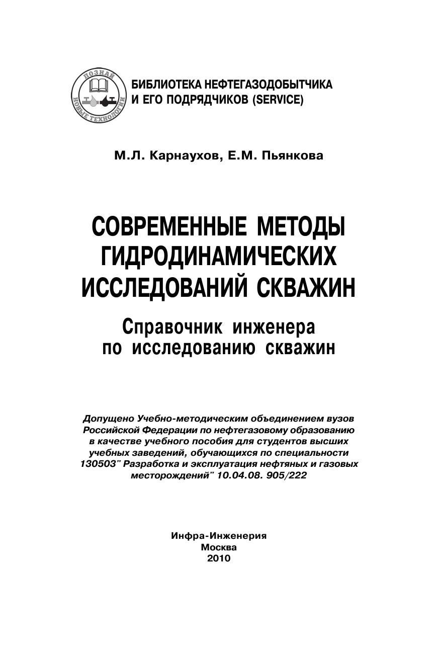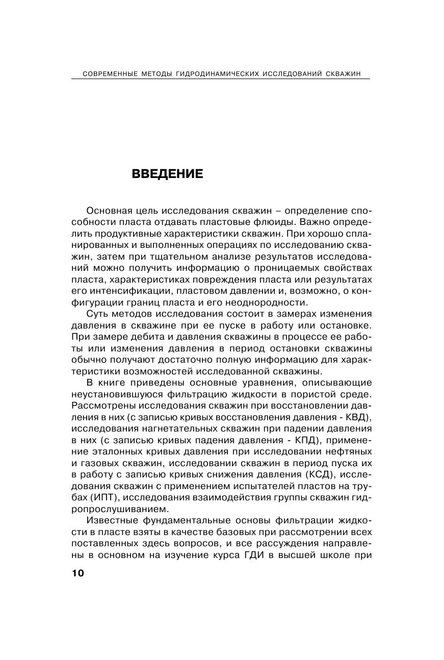Рассмотрены современные подходы к работе и обработке результатов исследования поисково-разведочных и эксплуатационных скважин гидродинамическими методами. Приведены выводы исходных уравнений и решения разнообразных задач, связанных со стационарными и нестационарными гидродинамическими исследованиями скважин. На практических примерах проиллюстрированы различные методики интерпретации диаграмм давления и анализа результатов гидродинамических исследований скважин. Рекомендовано для студентов нефтяных вузов и факультетов, обучающихся по специальности «Разработка и эксплуатация нефтяных и газовых скважин», а также для специалистов нефтегазовой отрасли, занимающихся испытаниями и исследованиями скважин и пластов.