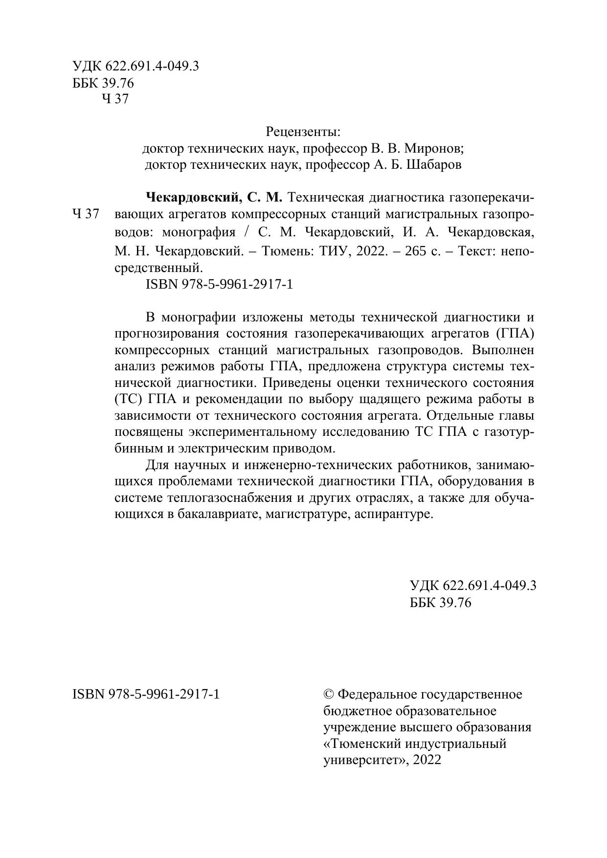 В монографии изложены методы технической диагностики и прогнозирования состояния газоперекачивающих агрегатов (ГПА) компрессорных станций магистральных газопроводов. Выполнен анализ режимов работы ГПА, предложена структура системы технической диагностики. Приведены оценки технического состояния (ТС) ГПА и рекомендации по выбору щадящего режима работы в зависимости от технического состояния агрегата. Отдельные главы посвящены экспериментальному исследованию ТС ГПА с газотурбинным и электрическим приводом. Для научных и инженерно-технических работников, занимающихся проблемами технической диагностики ГПА, оборудования в системе теплогазоснабжения и других отраслях, а также для обучающихся в бакалавриате, магистратуре, аспирантуре.