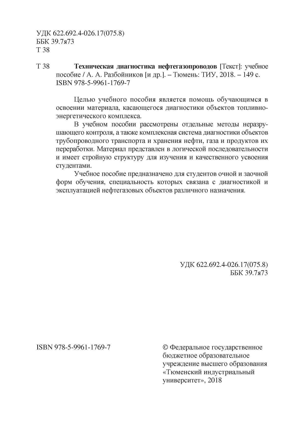 Целью учебного пособия является помощь обучающимся в освоении материала, касающегося диагностики объектов топливно-энергетического комплекса.