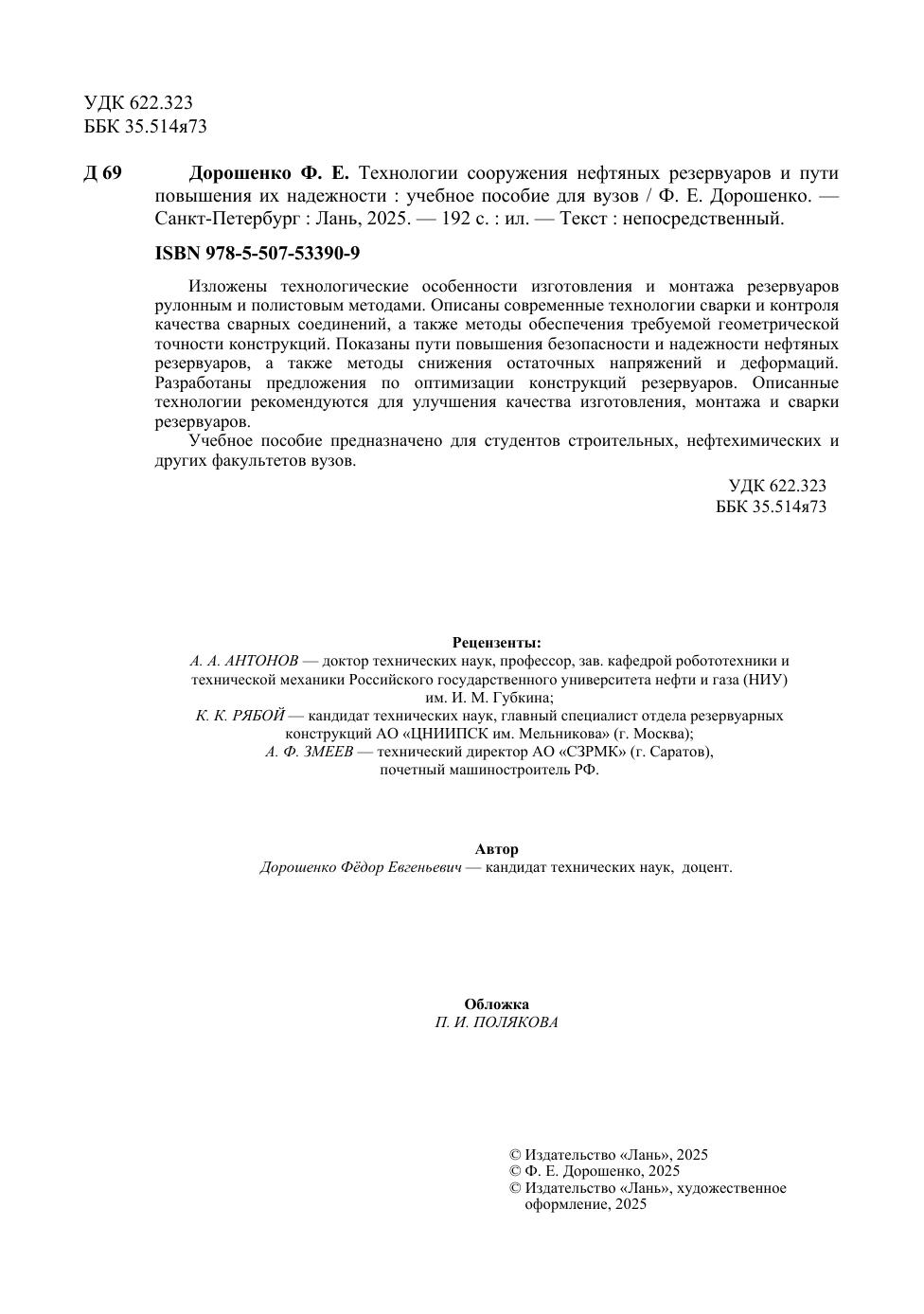Изложены технологические особенности изготовления и монтажа резервуаров рулонным и полистовым методами. Описаны современные технологии сварки и контроля качества сварных соединений, а также методы обеспечения требуемой геометрической точности конструкций. Показаны пути повышения безопасности и надежности нефтяных резервуаров, а также методы снижения остаточных напряжений и деформаций. Разработаны предложения по оптимизации конструкций резервуаров. Описанные технологии рекомендуются для улучшения качества изготовления, монтажа и сварки резервуаров. Учебное пособие предназначено для студентов строительных, нефтехимических и других факультетов вузов.