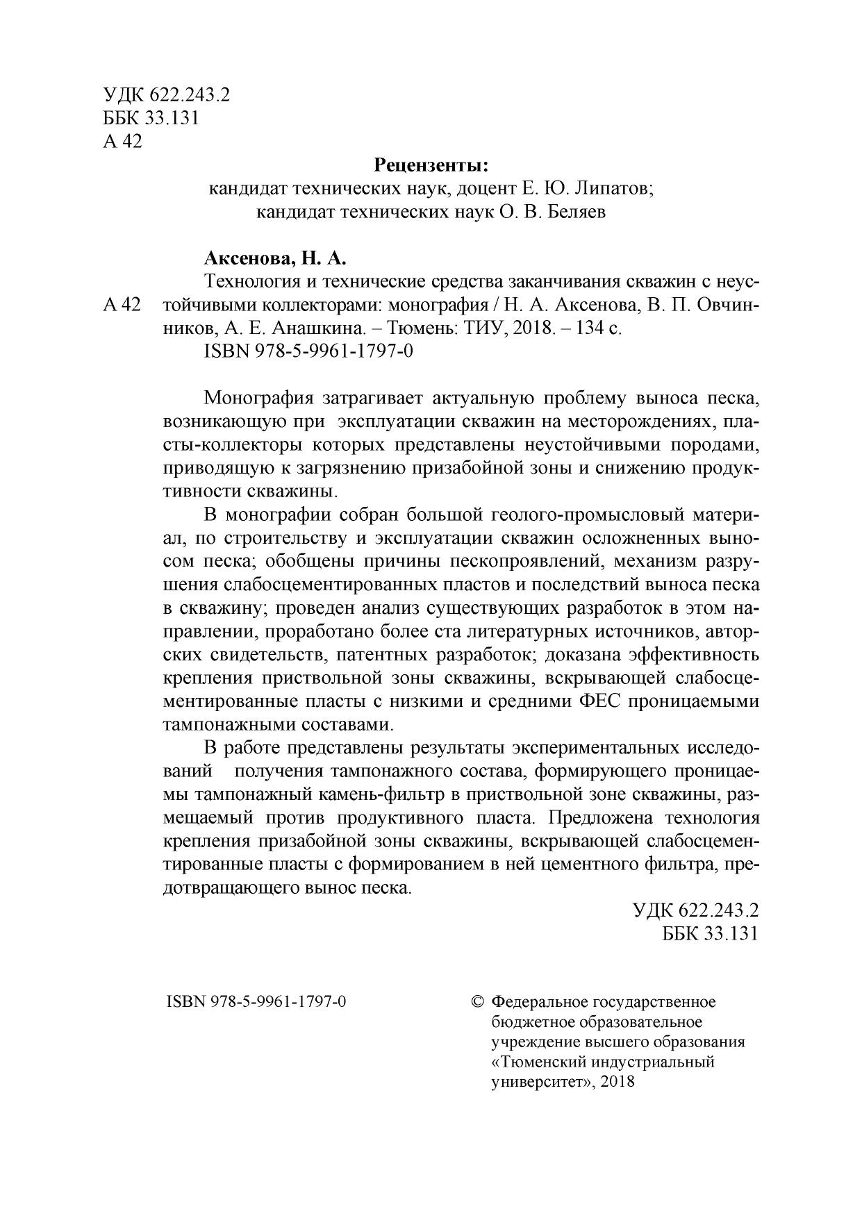 В монографии собран большой геолого-промысловый материал, по строительству и эксплуатации скважин осложненных выносом песка; обобщены причины пескопроявлений, механизм разрушения слабосцементированных пластов и последствий выноса песка в скважину; проведен анализ существующих разработок в этом направлении, проработано более ста литературных источников, авторских свидетельств, патентных разработок; доказана эффективность крепления приствольной зоны скважины, вскрывающей слабосцементированные пласты с низкими и средними ФЕС проницаемыми тампонажными составами.