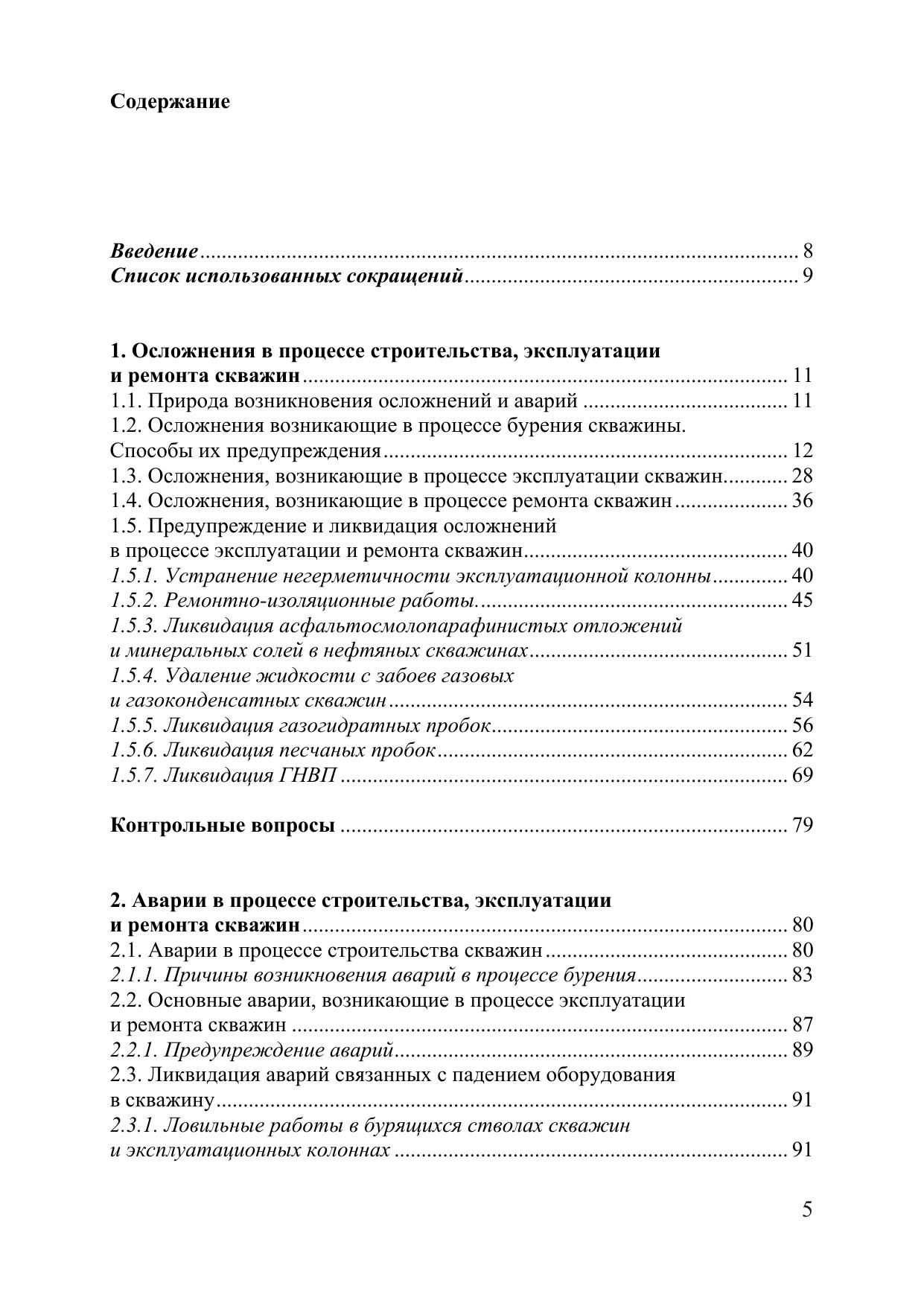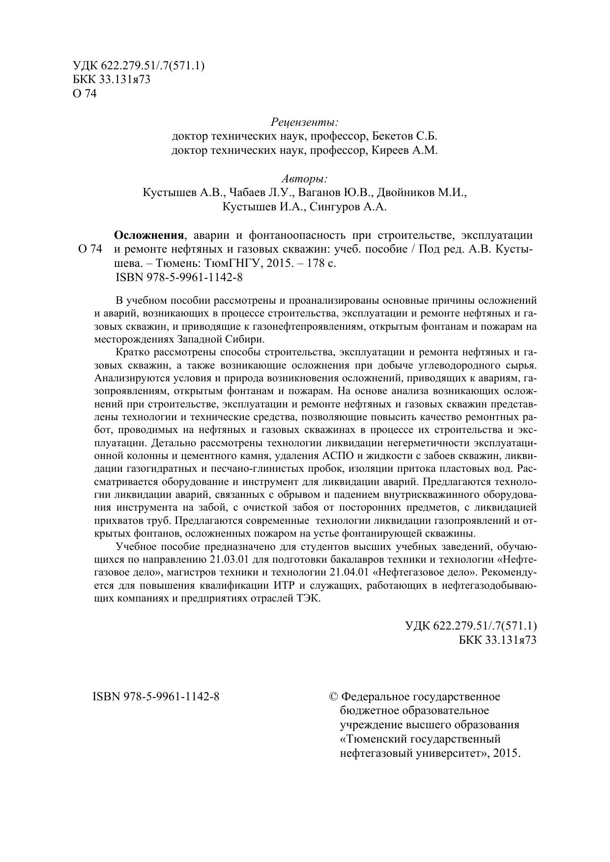В учебном пособии рассмотрены и проанализированы основные причины осложнений и аварий, возникающих в процессе строительства, эксплуатации и ремонте нефтяных и газовых скважин, и приводящие к газонефтепроявлениям, открытым фонтанам и пожарам на месторождениях Западной Сибири. Кратко рассмотрены способы строительства, эксплуатации и ремонта нефтяных и газовых скважин, а также возникающие осложнения при добыче углеводородного сырья. Анализируются условия и природа возникновения осложнений, приводящих к авариям, газопроявлениям, открытым фонтанам и пожарам. На основе анализа возникающих ослож-нений при строительстве, эксплуатации и ремонте нефтяных и газовых скважин представлены технологии и технические средства, позволяющие повысить качество ремонтных работ, проводимых на нефтяных и газовых скважинах в процессе их строительства и эксплуатации. Детально рассмотрены технологии ликвидации негерметичности эксплуатационной колонны и цементного камня, удаления АСПО и жидкости с забоев скважин, ликви-дации газогидратных и песчано-глинистых пробок, изоляции притока пластовых вод. Рассматривается оборудование и инструмент для ликвидации аварий. Предлагаются технологии ликвидации аварий, связанных с обрывом и падением внутрискважинного оборудования инструмента на забой, с очисткой забоя от посторонних предметов, с ликвидацией прихватов труб. Предлагаются современные технологии ликвидации газопроявлений и открытых фонтанов, осложненных пожаром на устье фонтанирующей скважины. Учебное пособие предназначено для студентов высших учебных заведений, обучающихся по направлению 21.03.01 для подготовки бакалавров техники и технологии «Нефтегазовое дело», магистров техники и технологии 21.04.01 «Нефтегазовое дело». Рекомендуется для повышения квалификации ИТР и служащих, работающих в нефтегазодобывающих компаниях и предприятиях отраслей ТЭК.