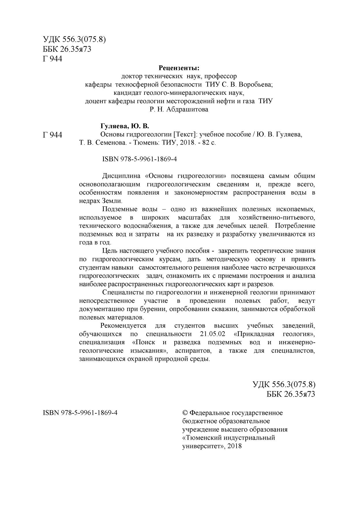 Рекомендуется для студентов высших учебных заведений, обучающихся по специальности 21.05.02 «Прикладная геология», специализация «Поиск и разведка подземных вод и инженерногеологические изыскания», аспирантов, а также для специалистов, занимающихся охраной природной среды.