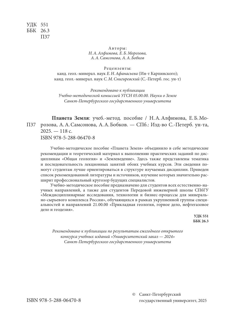 Учебно-методическое пособие "Планета Земля" объединило в себе методические рекомендации и теоретический материал к выполнению практических заданий по дисциплинам "Общая геология" и "Землеведение". Здесь также представлены тематика и последовательность лекционных занятий обоих учебных курсов. Эти сведения помогут студентам лучше ориентироваться в структуре изучаемых дисциплин. Приведен список рекомендованной литературы и источников, изучение которых значительно расширит профессиональный кругозор будущих специалистов. Учебно-методическое пособие предназначено для студентов Передовой инженерной школы СПбГУ "Междисциплинарные исследования. технологии и бизнес-процессы для минерально-сырьевого комплекса России", обучающихся в рамках укрупненной группы специальностей и направлений 21.00.00 "Прикладная геология, горное дело, нефтегазовое дело и геодезия".